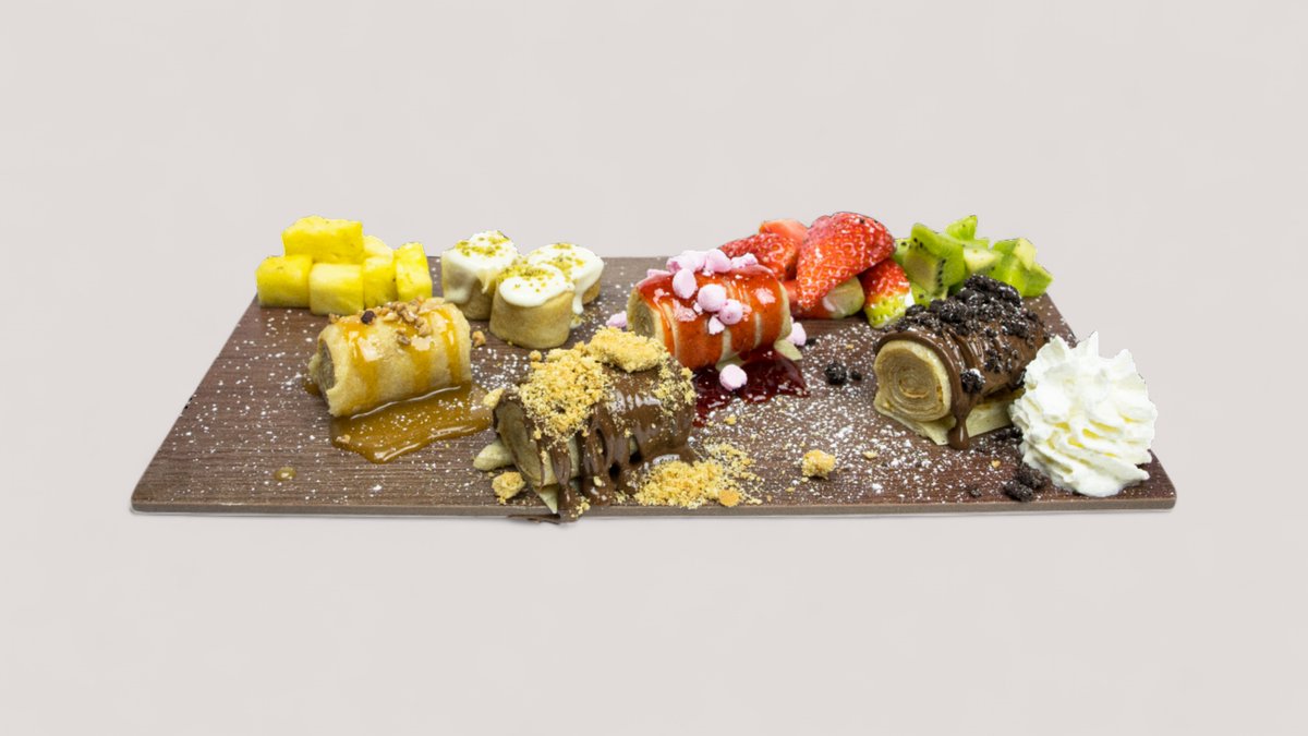 Crêpesrullar i olika toppingar och smaker som serveras med frukt