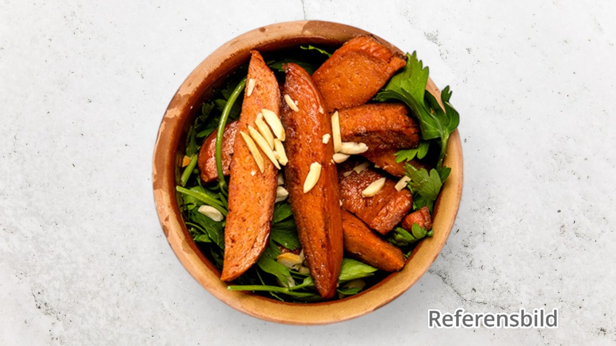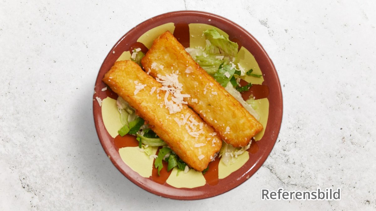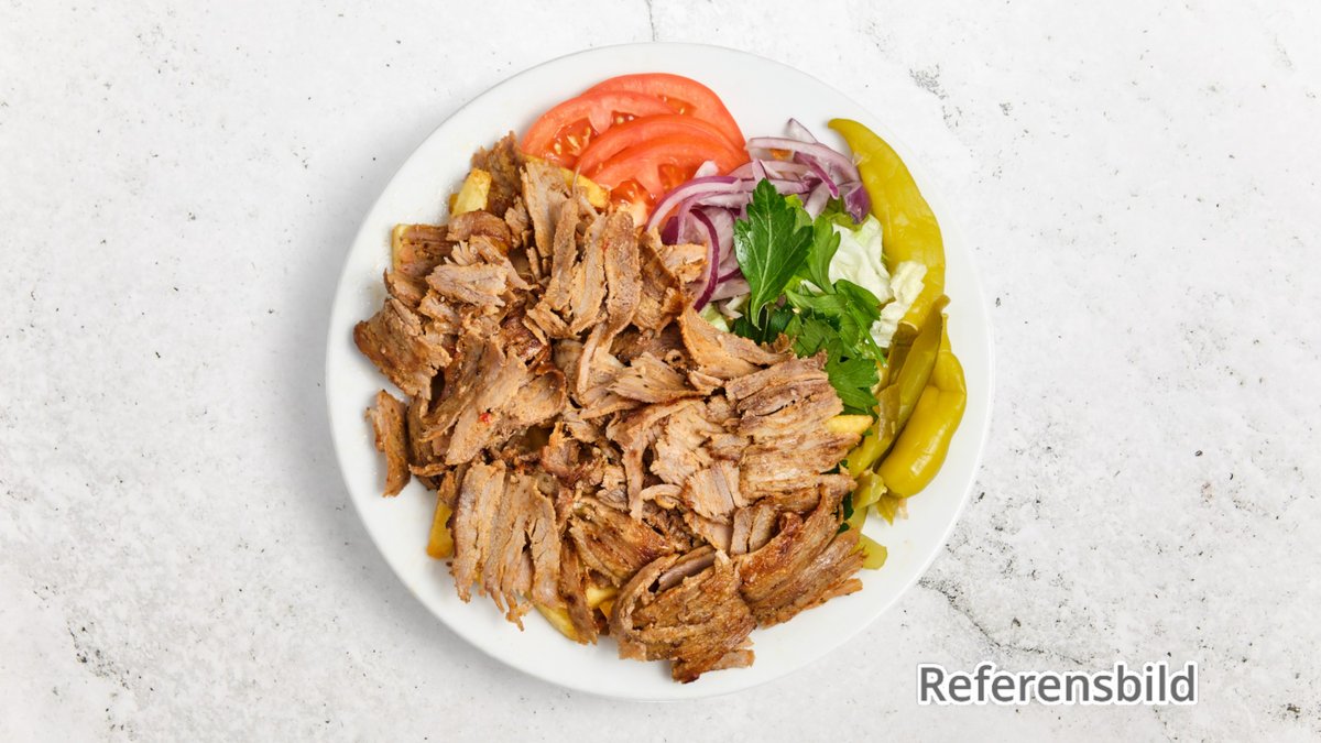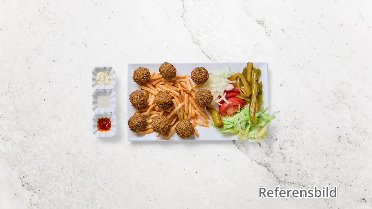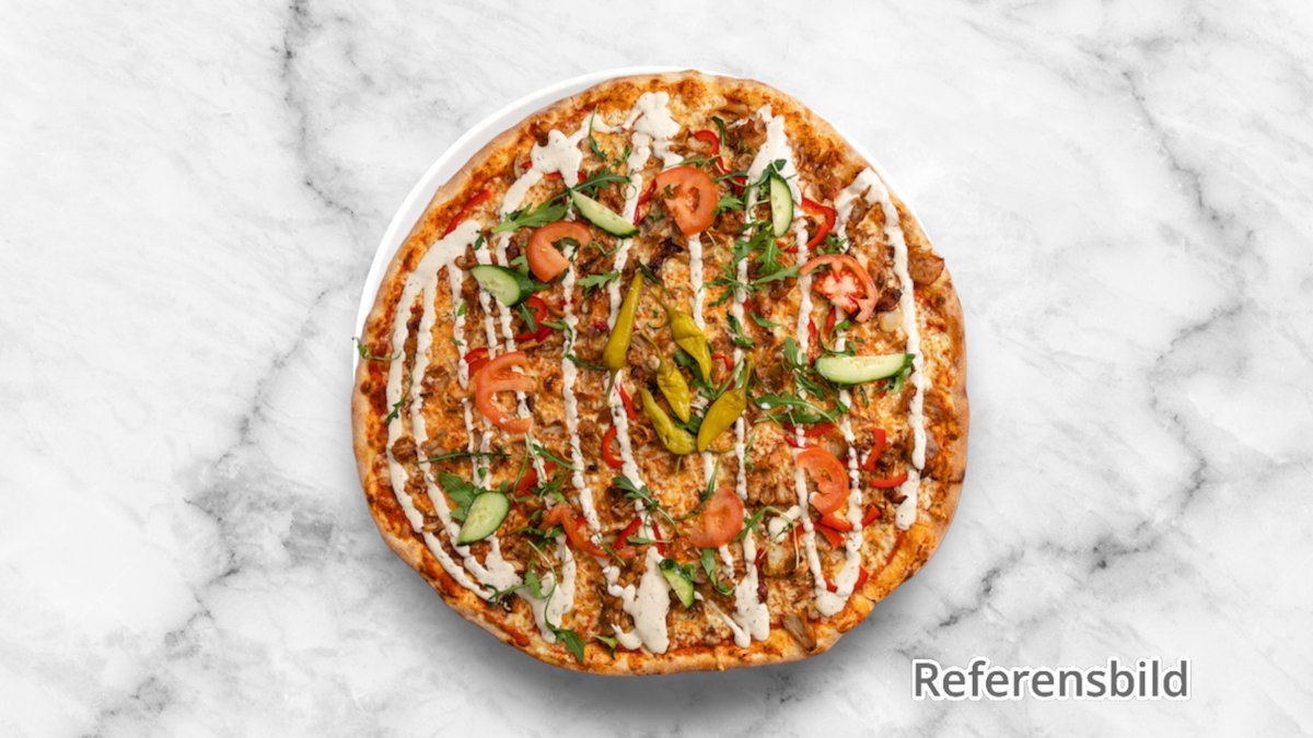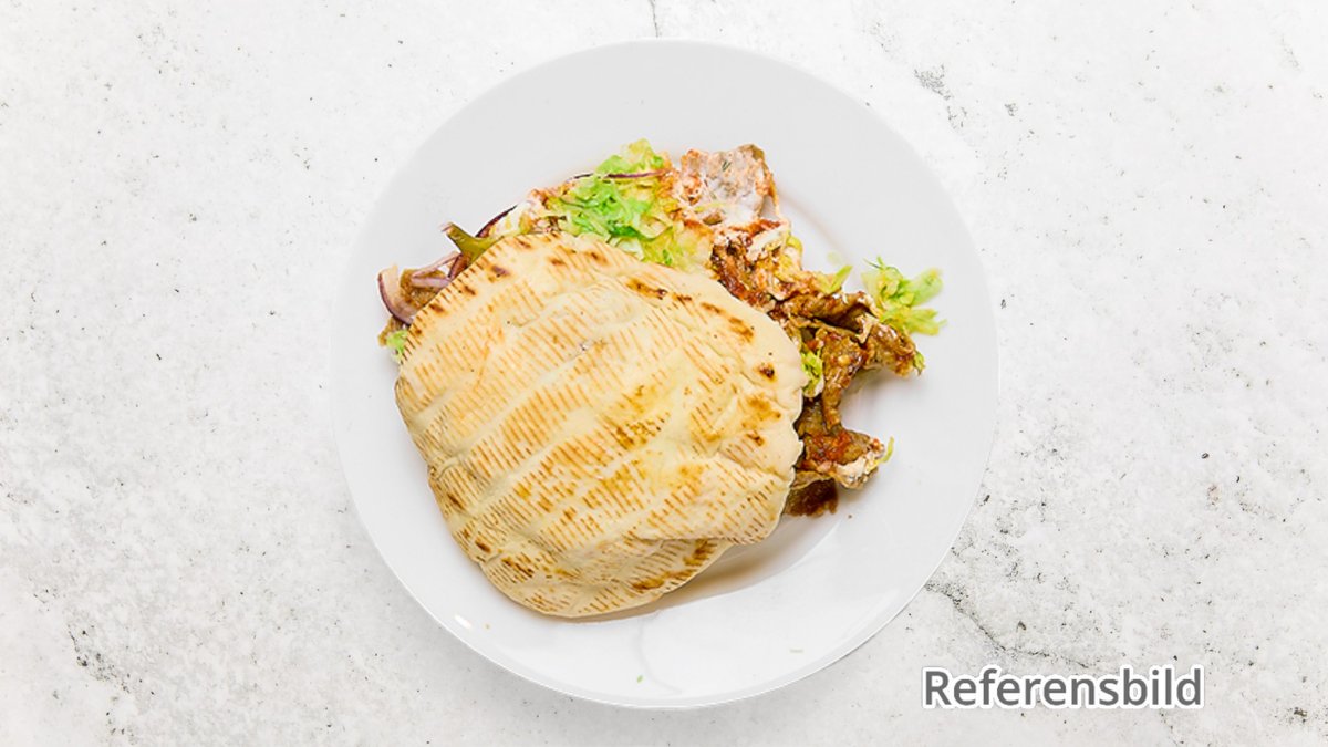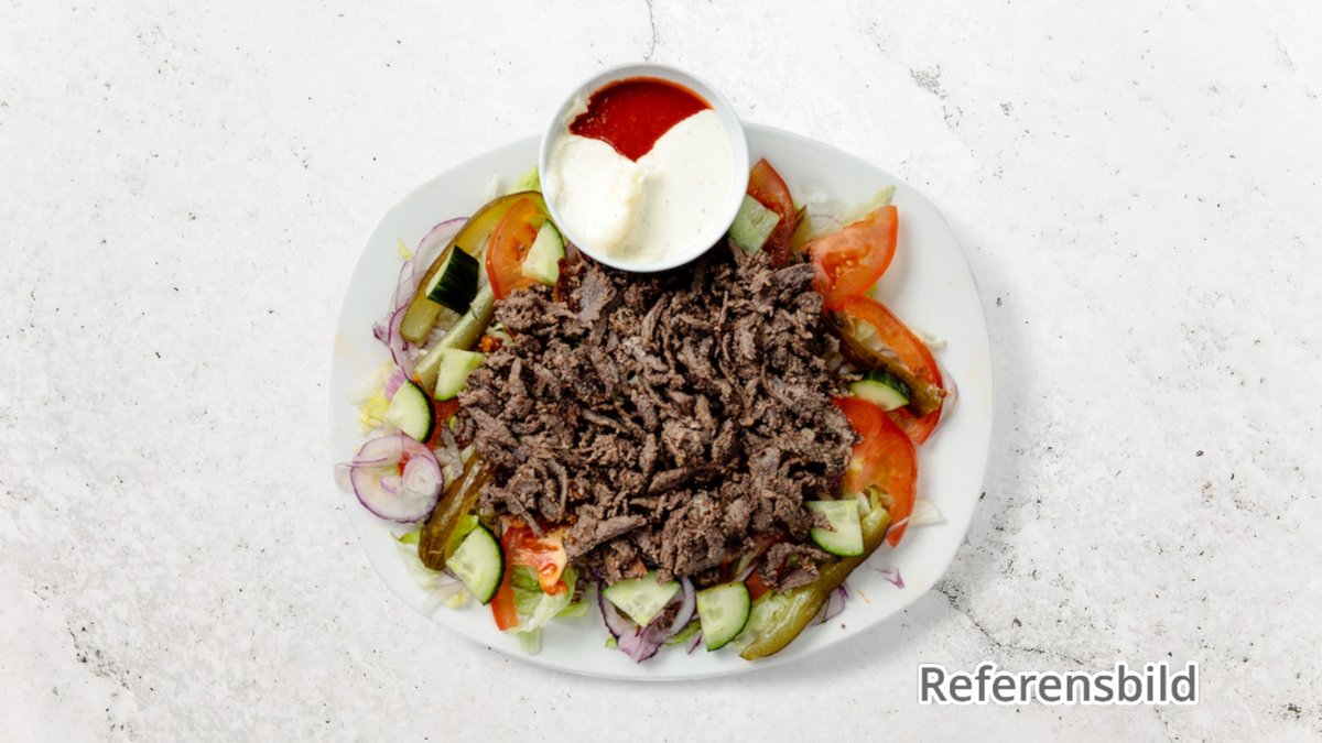 Med sallad, tomat, gurka, rödlök och valfrisås.