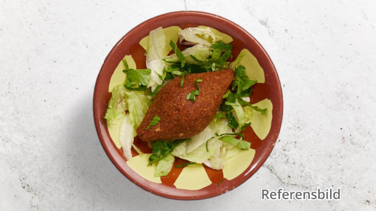 Med isbergssallad, tomat, gurka, lök och valfri sås.
