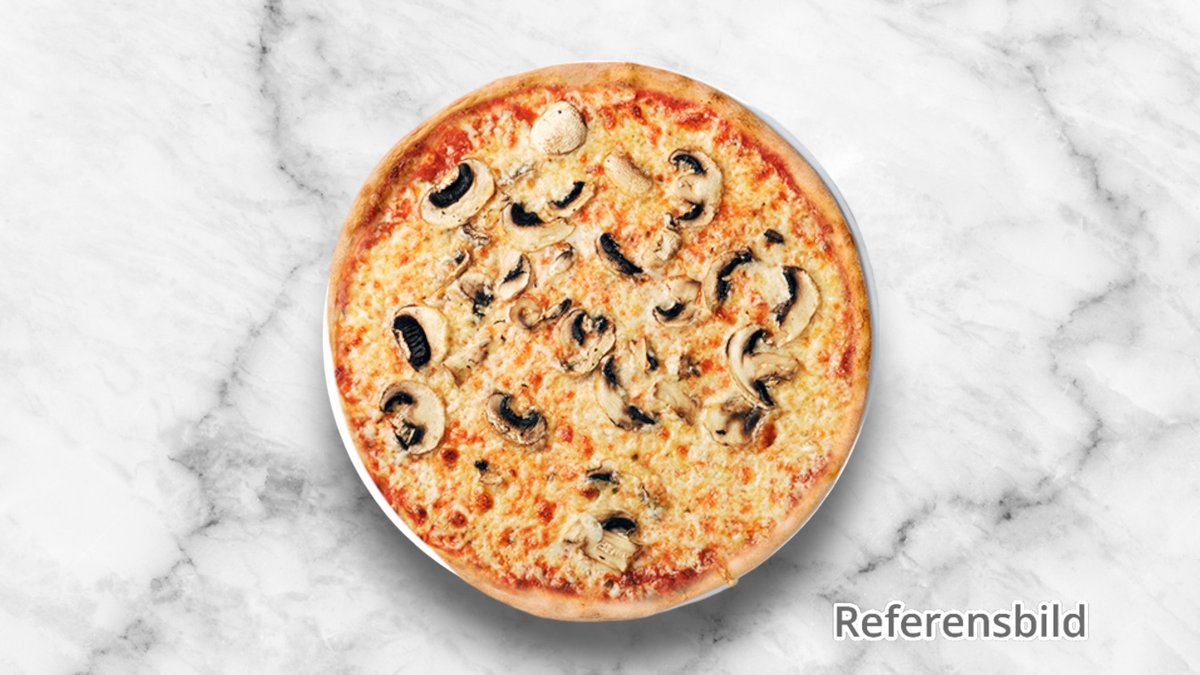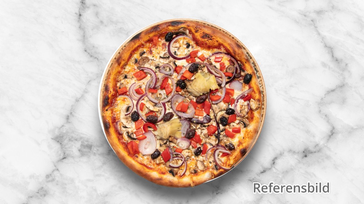 Champinjoner, lök, paprika, kronärtskocka och oliver.