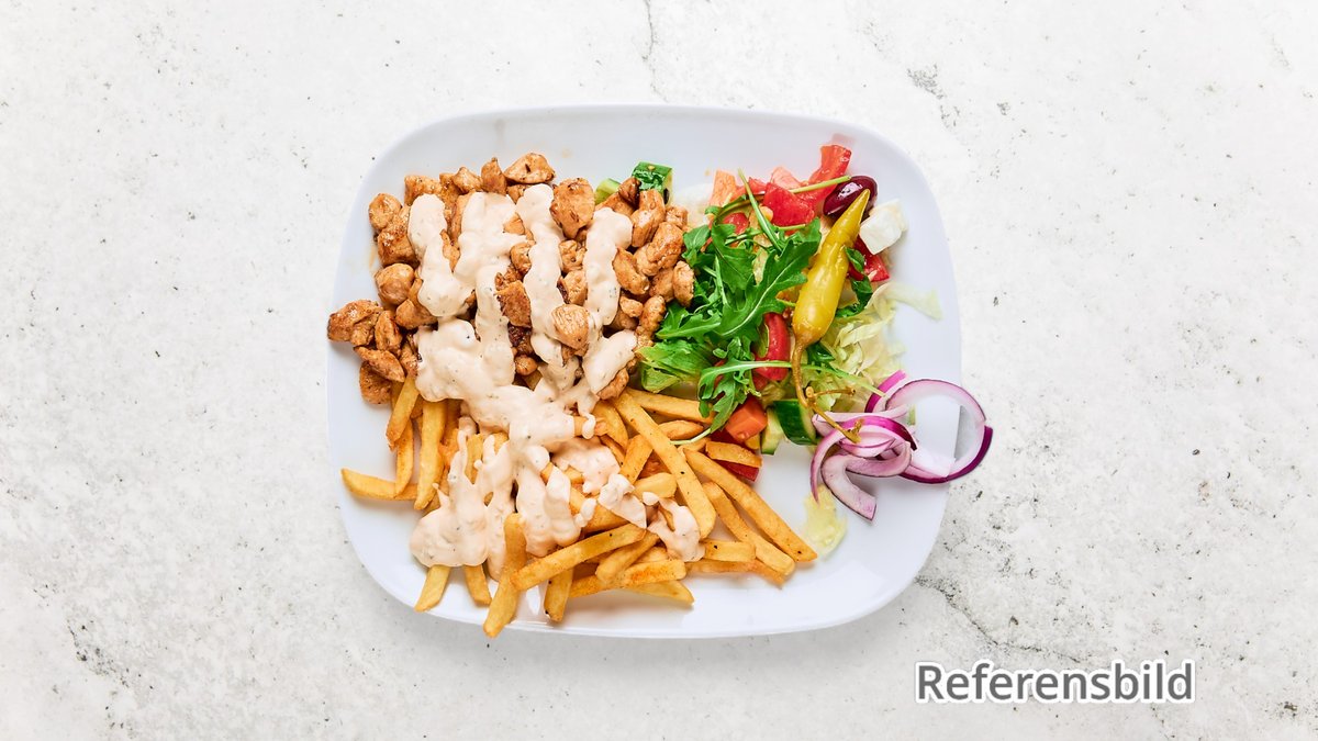 Kycling, vitlökscream, citron, saltgurka och tomat.