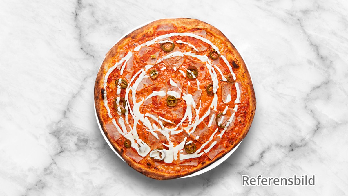 Tomatsås, ost, skinka, jalapeño, tacosås, tacokrydda och vitlök.