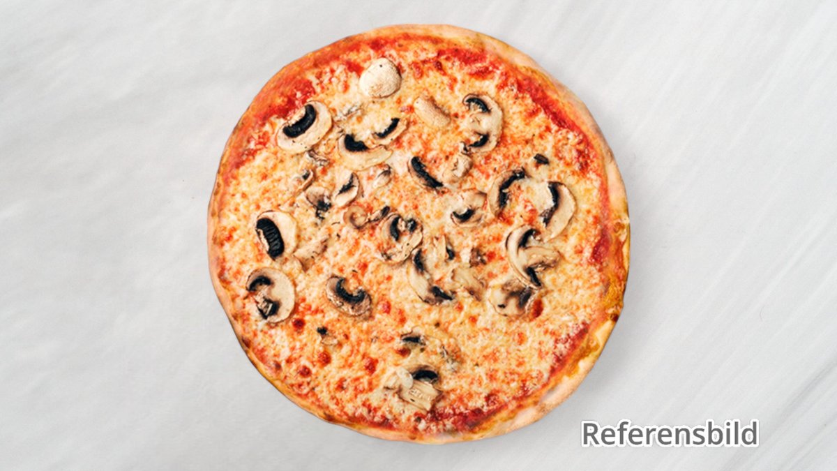 Tomatsås, ost, champinjoner, ananas, paprika, majs, tomater, oliver och lök.