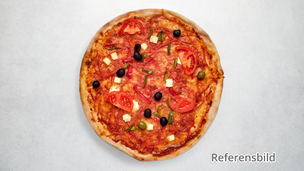 Tomatsås, ost, skinka, fetaost, oliver och tomater.