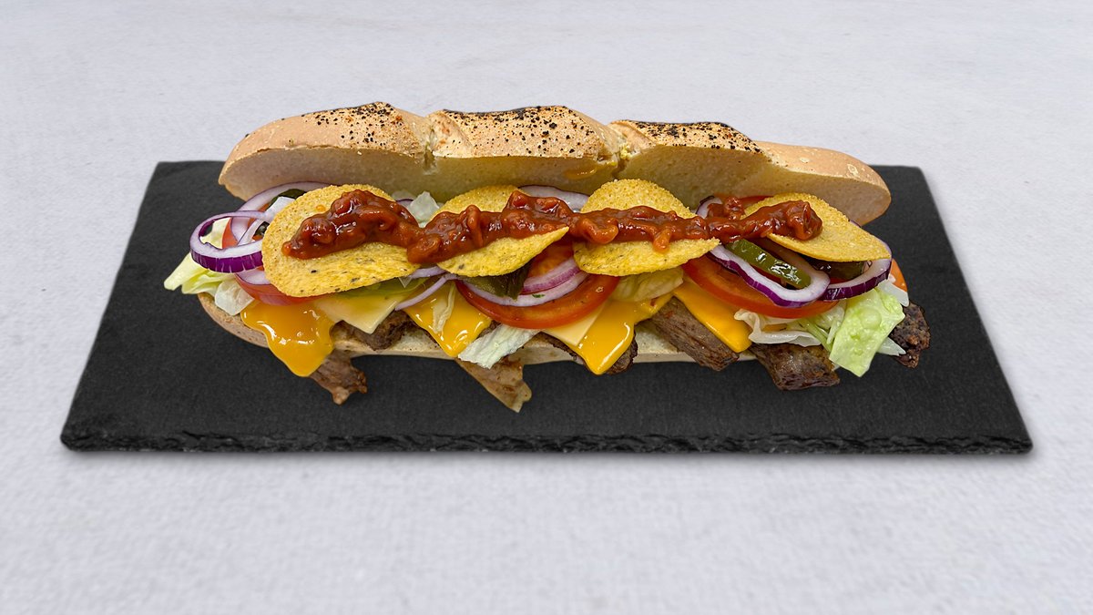 Grillade biffbitar, amerikansk cheddarost, sallad, tomat, rödlök, jalapeño, nachochips och salsasås.