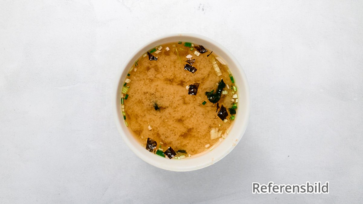 Misosoppa, färsk tofu, wakamealger. (det är kalt, ska värma upp)