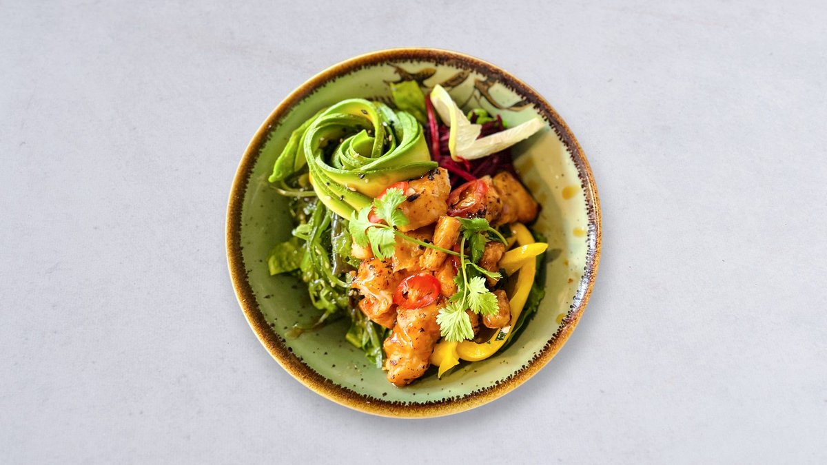 Lax, röd chili, chilipulver, citron och koriander. Serveras med sallad, avokado, ris och grönsaker. Serveras med sirachamajo och teriyaki.