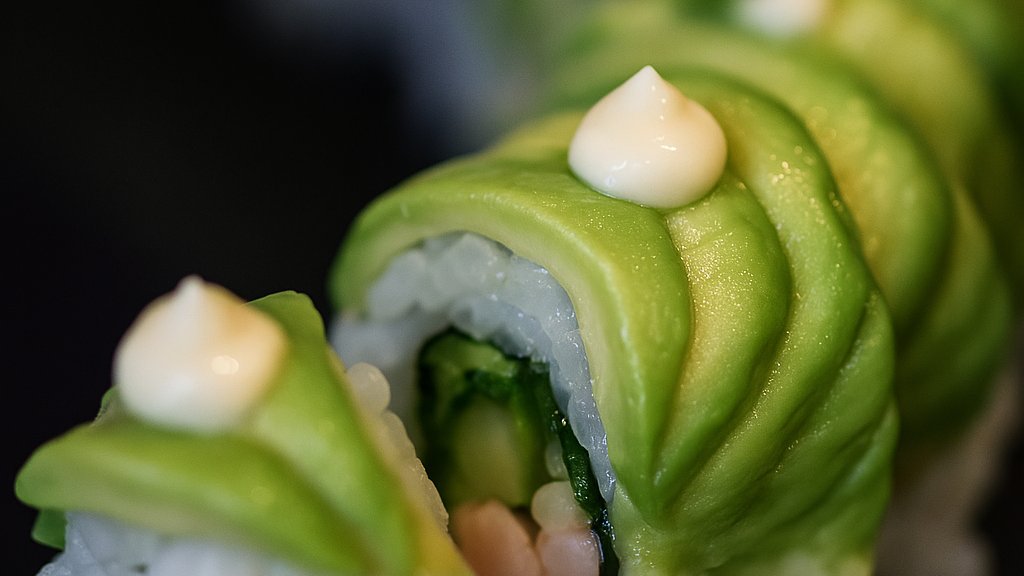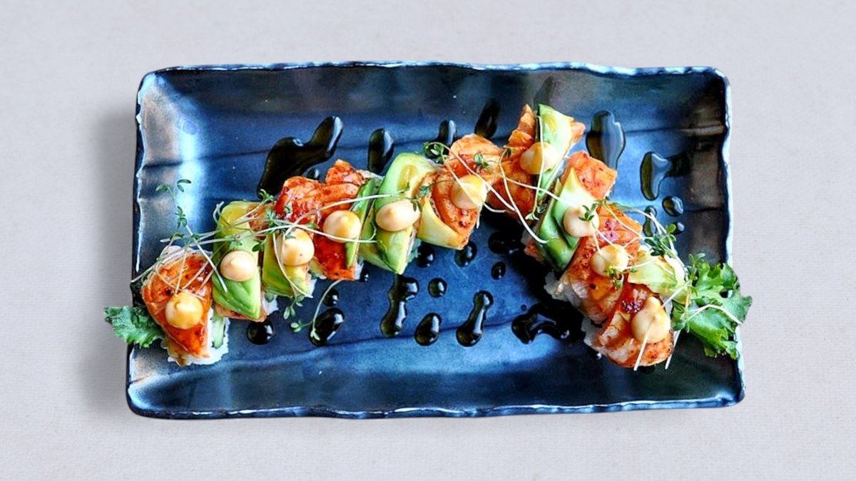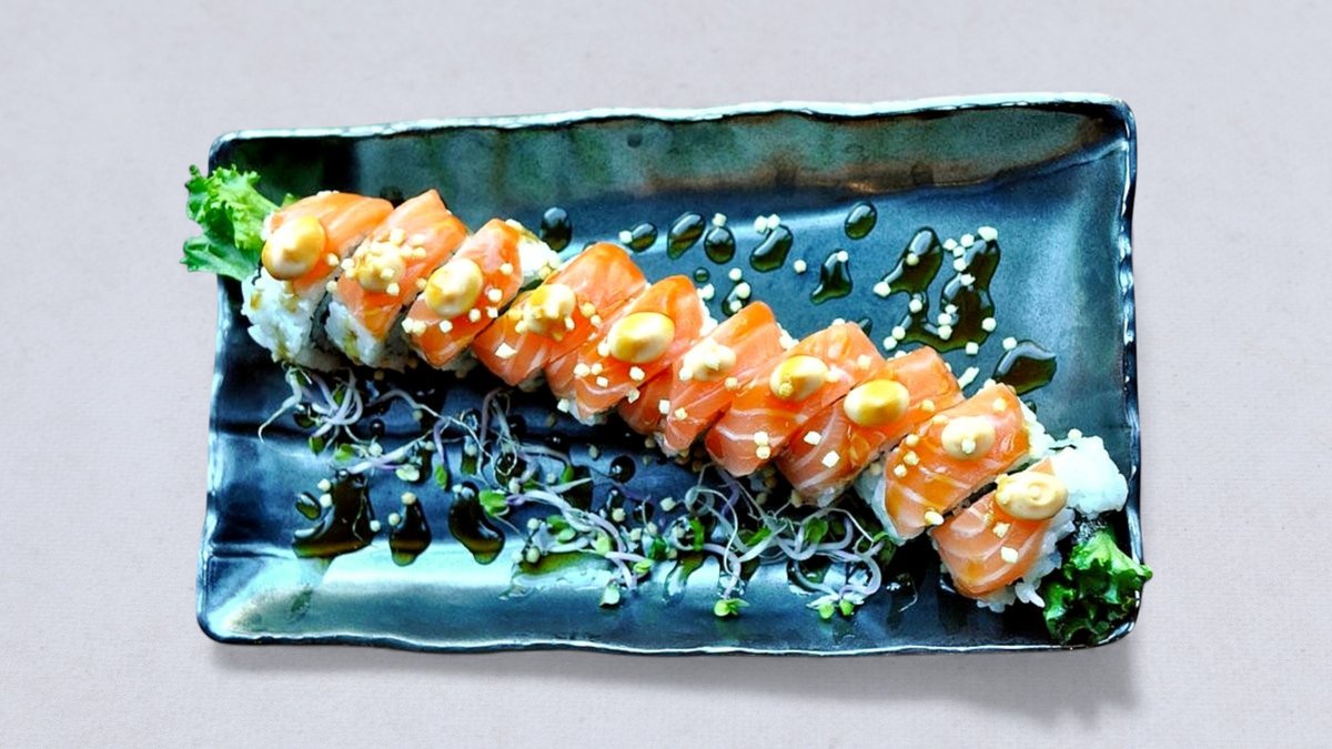 Krämig inside-out maki med philadelphiaost, ost, sallad, lax, rostad lök och teriyakisås.