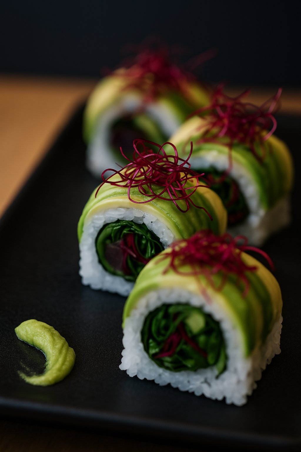 Sallad, gurka och avokado. Toppad med fem olika fiskar och wasabimajo.