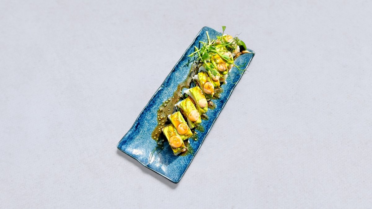 Friterad räka, krispig gurka, sallad, avokado och kimchimajo. Toppad med avokado, majo och rostad lök.