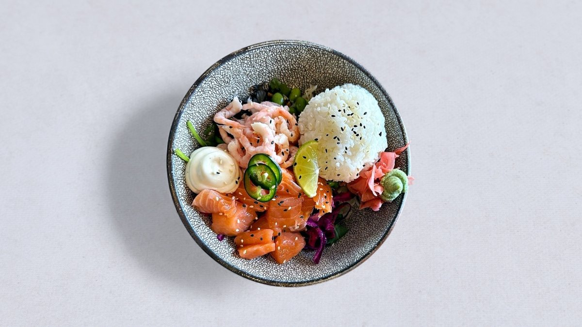 Poke med marinerade lax i ponzo sås och avokado. Syrade grönsaker, grönsallad och kimchimajo. Toppad med teriyaki.
