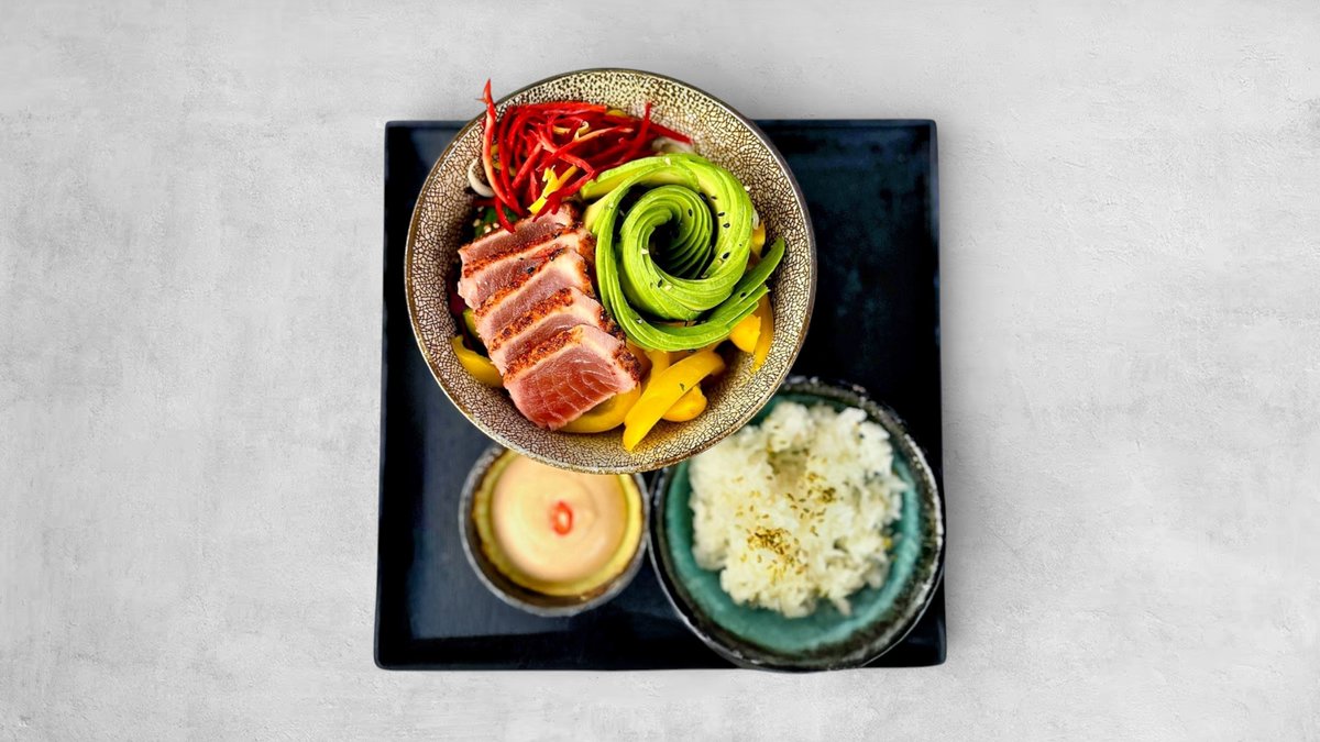 Tonfisk halstrad med togarashi, ris, avokado, kockens val av grönsaker