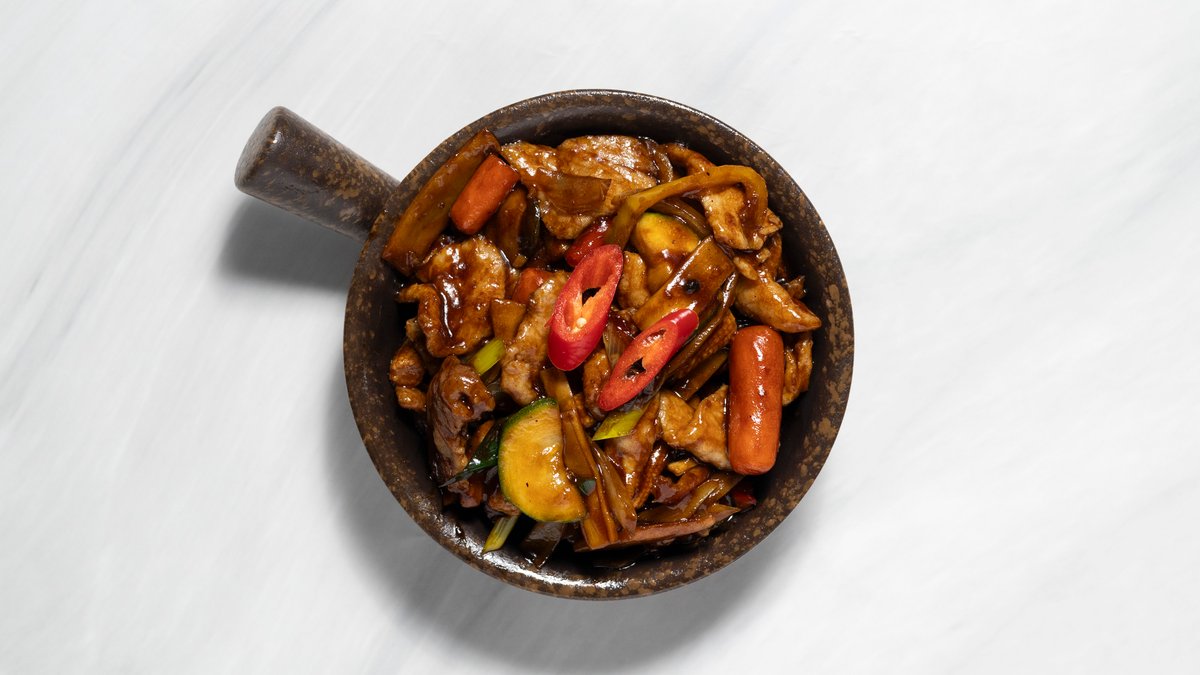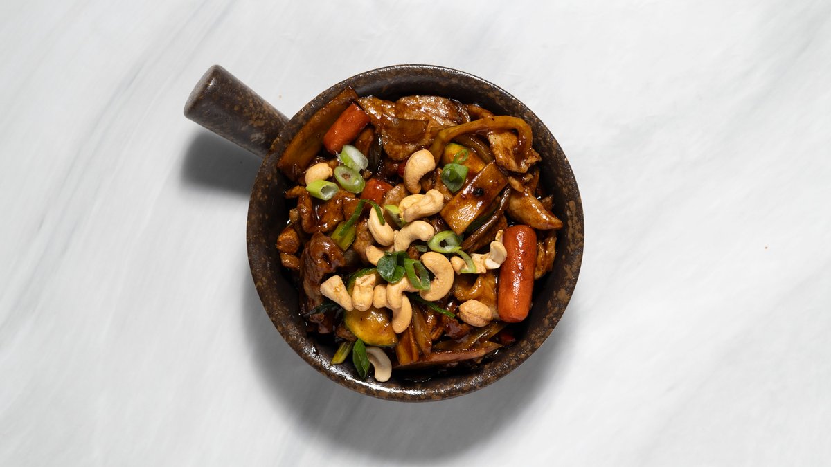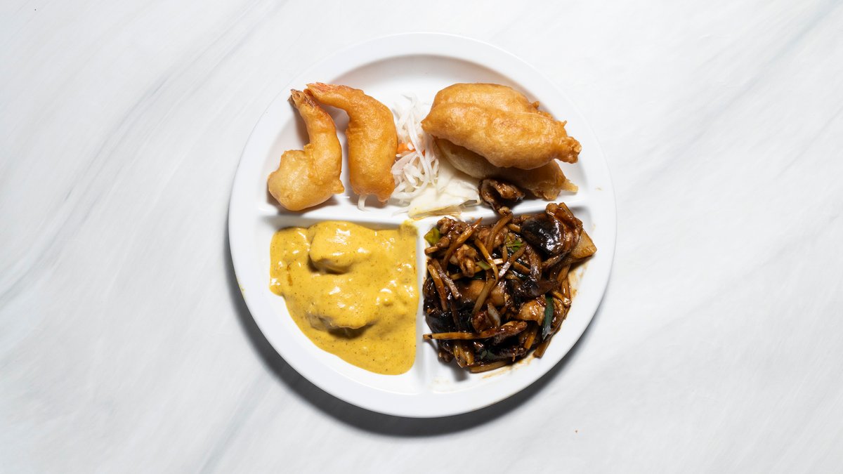 Fläsk med bambuskott och champinjoner, kyckling curry, friterad kyckling och räkor med sötsursås. Välj bas i nästa steg.