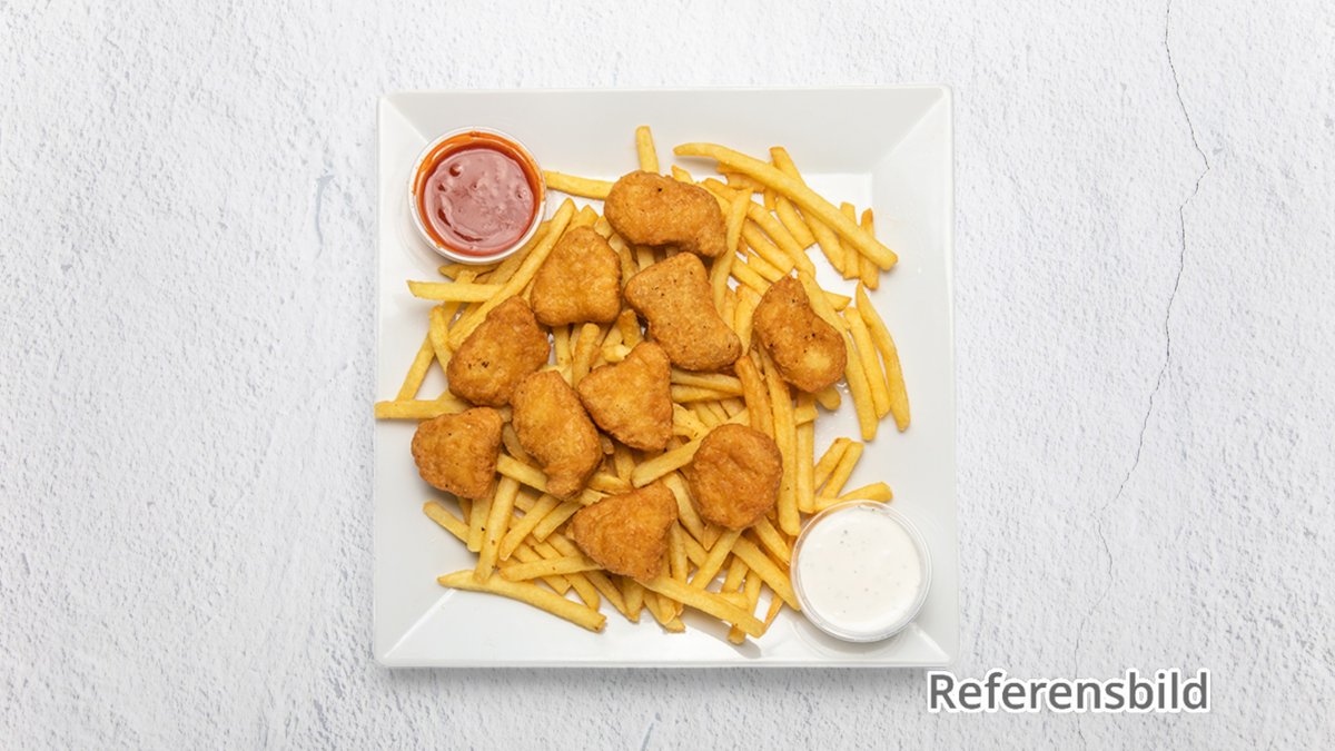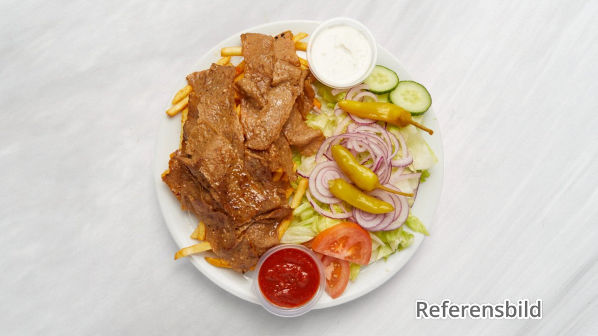 Serveras med kebabkött, grönsaker, lök, feferoni, pommes frites och inkl läsk.