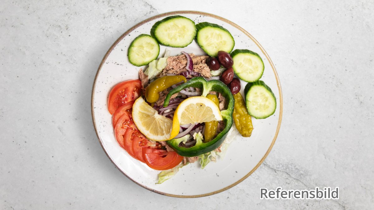 Sallad med isbergssallad, tomat, tonfisk, rödlök, oliver och citron.