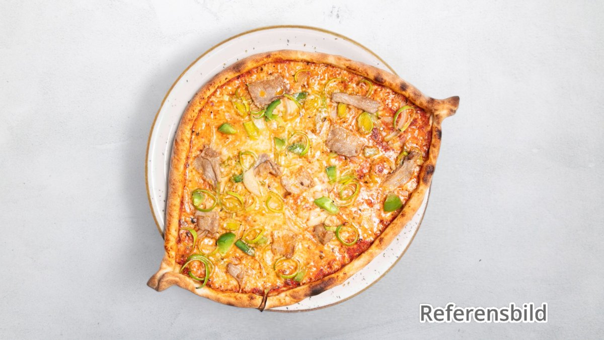 Pizza med kebabkött, feferoni, lök och tomater.