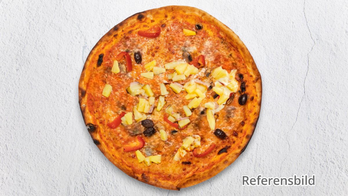 Pizza med skinka och ananas.
