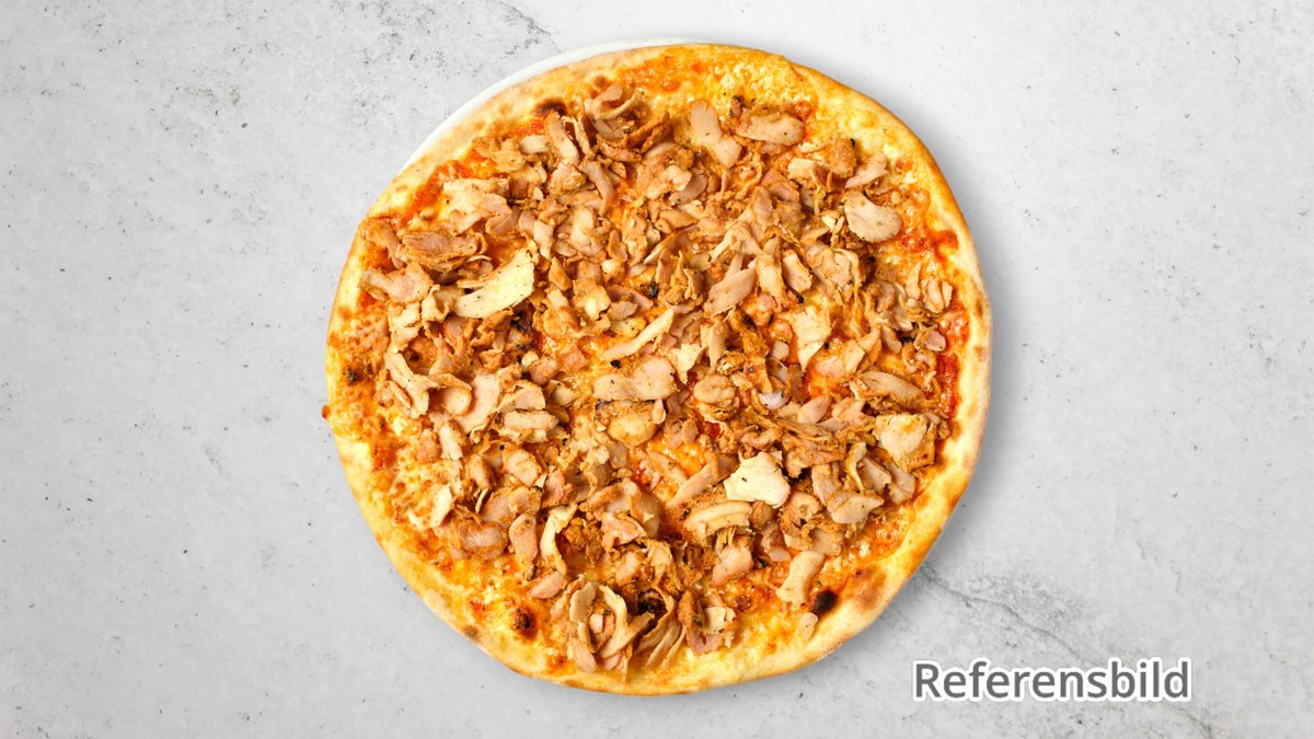 Pizza med kycklingkebab, lök, tomater och feferoni.
