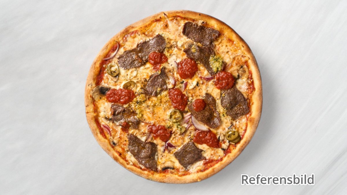 Pizza med oxfilé, jalapeño, färska champinjoner, lök, vitlök, beasås och tacokrydda.