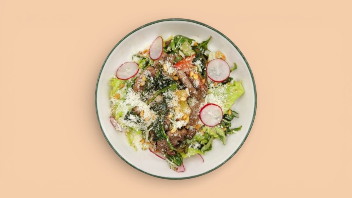210гр Перец калифорния, шпинат, вешенки, фасоль, руккола, лист салата, оливковое масло, винный уксус, Вырезка говяжья