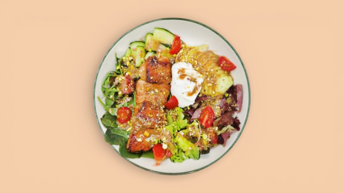 250гр Руккола, лолло росса, лист салата, огурец, томаты черри, шпинат, авокадо, яйцо-пашот, куриное филе, фисташки