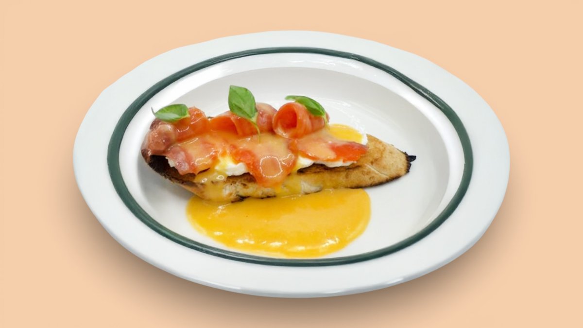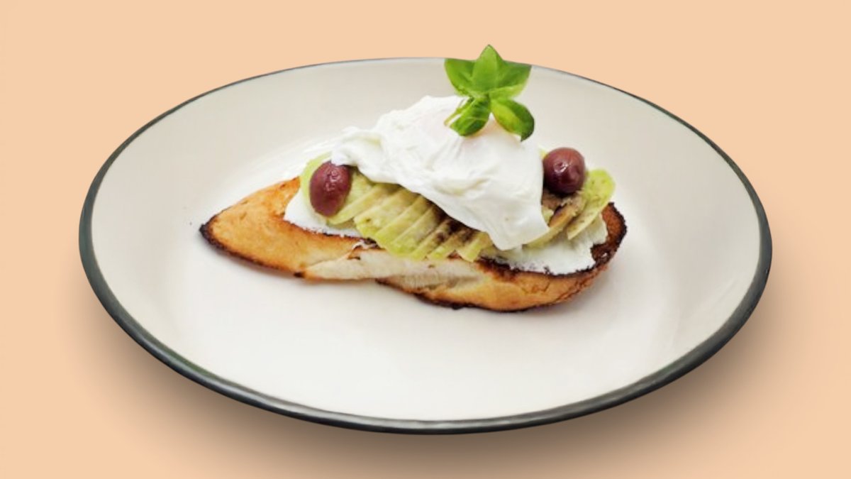 100гр Багет, творожный сыр, авокадо, оливковое масло, каламата, яйцо-пашот