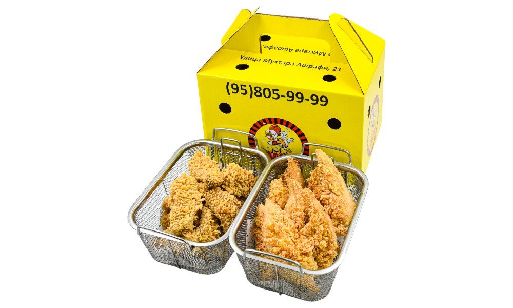 Нежнейшее и сочное куриное филе в хрустящей панировке + Экстремально острые и сочные крылышки в хрустящей панировке В стоимость входит упаковка 1порция: Куриные стрипсы 500 гр и острые крылышки 500 гр