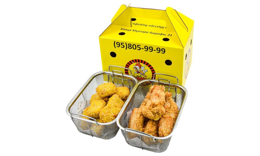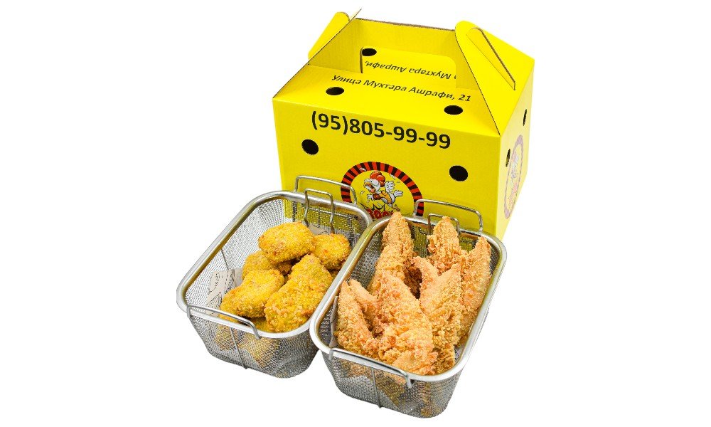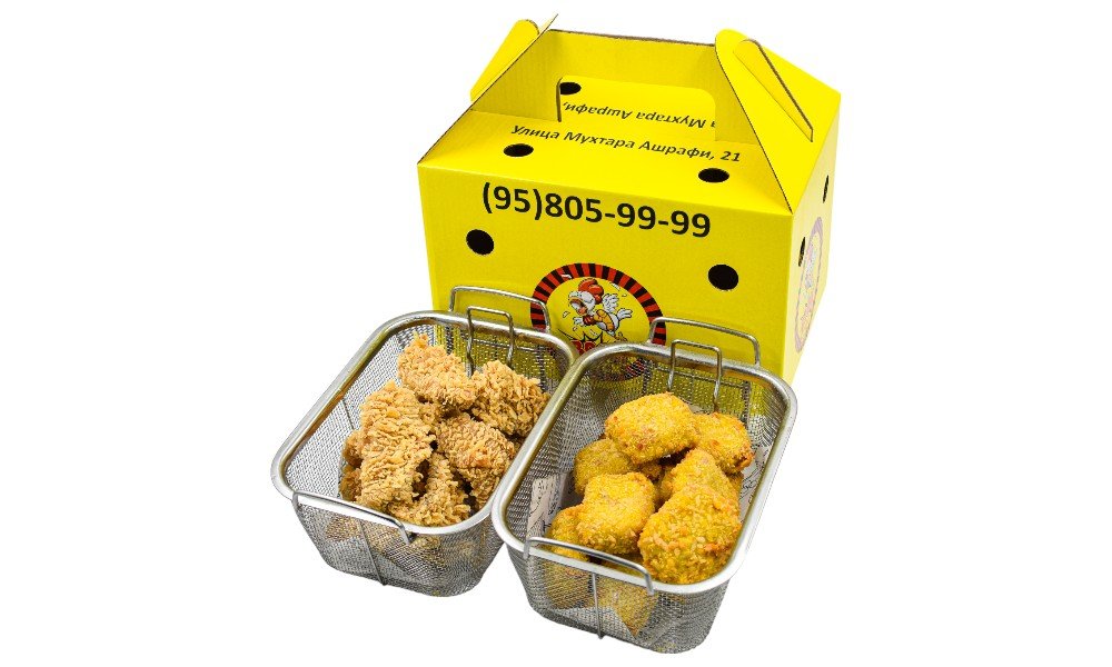 Хрустящие наггетсы из куриного фарша + Экстремально острые и сочные крылышки в хрустящей панировке В стоимость входит упаковка 1порция: Куриные наггетсы 500 гр и острые крылышки 500 гр