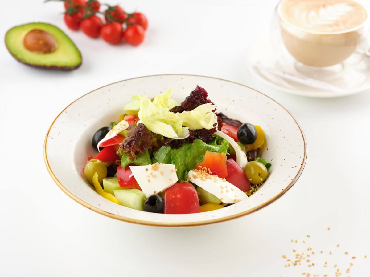 три вида болгарский, шарлота, айсберг, маслины оливки, салатный соус фирменный