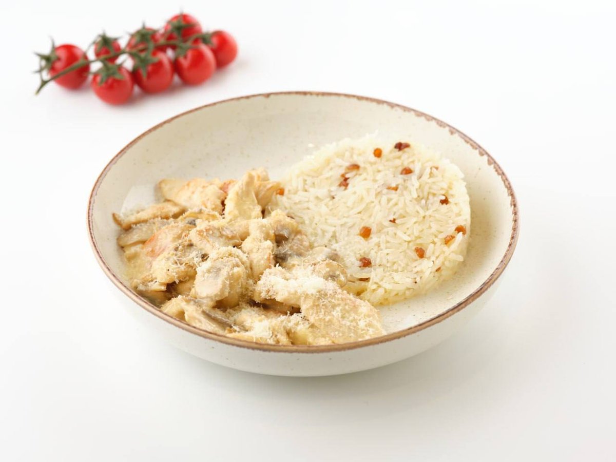 куриное филе, рис, грибы шампиньоны, пармезан сыр, сливочный соус