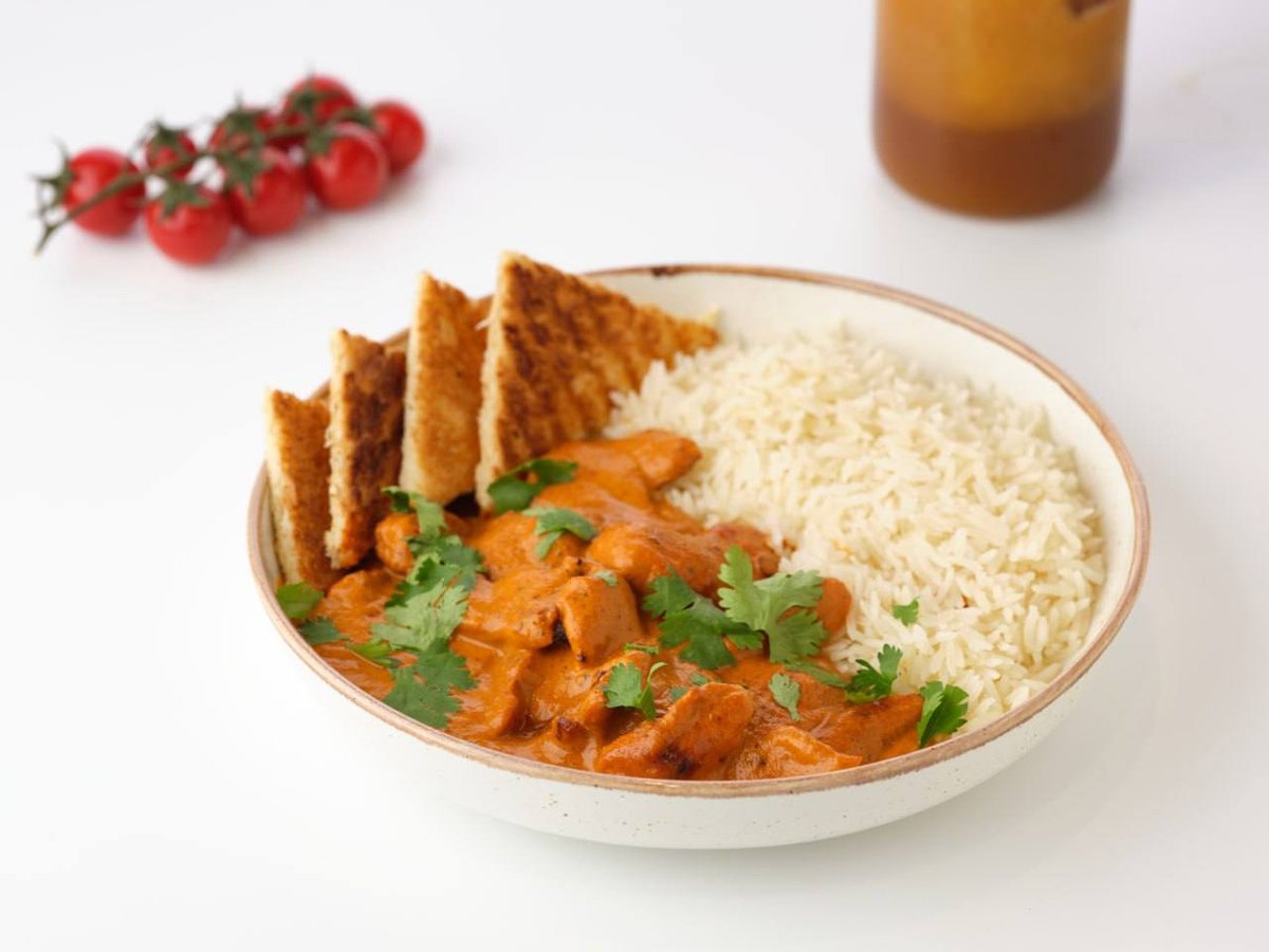 куриное филе, индийские специи, кинза, рис, тостер хлеб