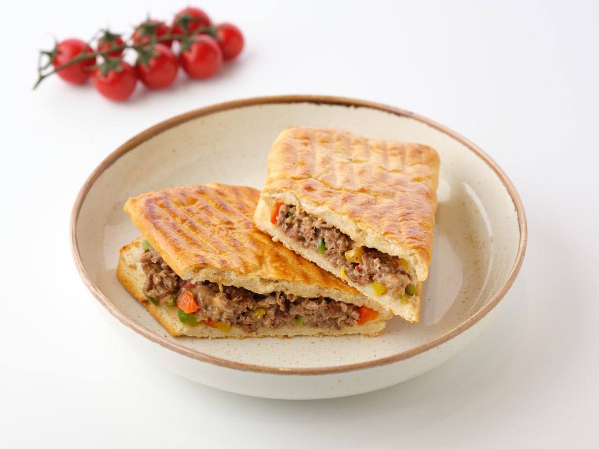 Булочка лонгер, говядина, три вида болгарского перца, сливки, лук шалот, сыр моцарелла