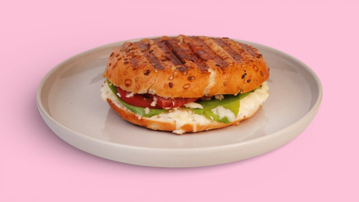 220 гр бейгл из ржаной муки, сыр мацарелла,помидор,шпинат, соус песто