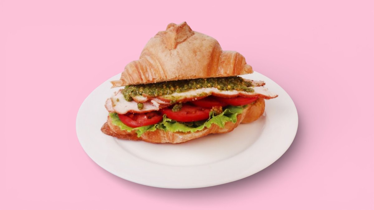 260 гр круассан , крем чиз, салатный лист, помидор, горчится зернистая,курица с паприкой ,соус песто , сыр мацарелла