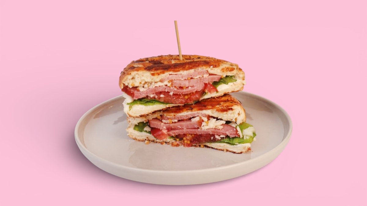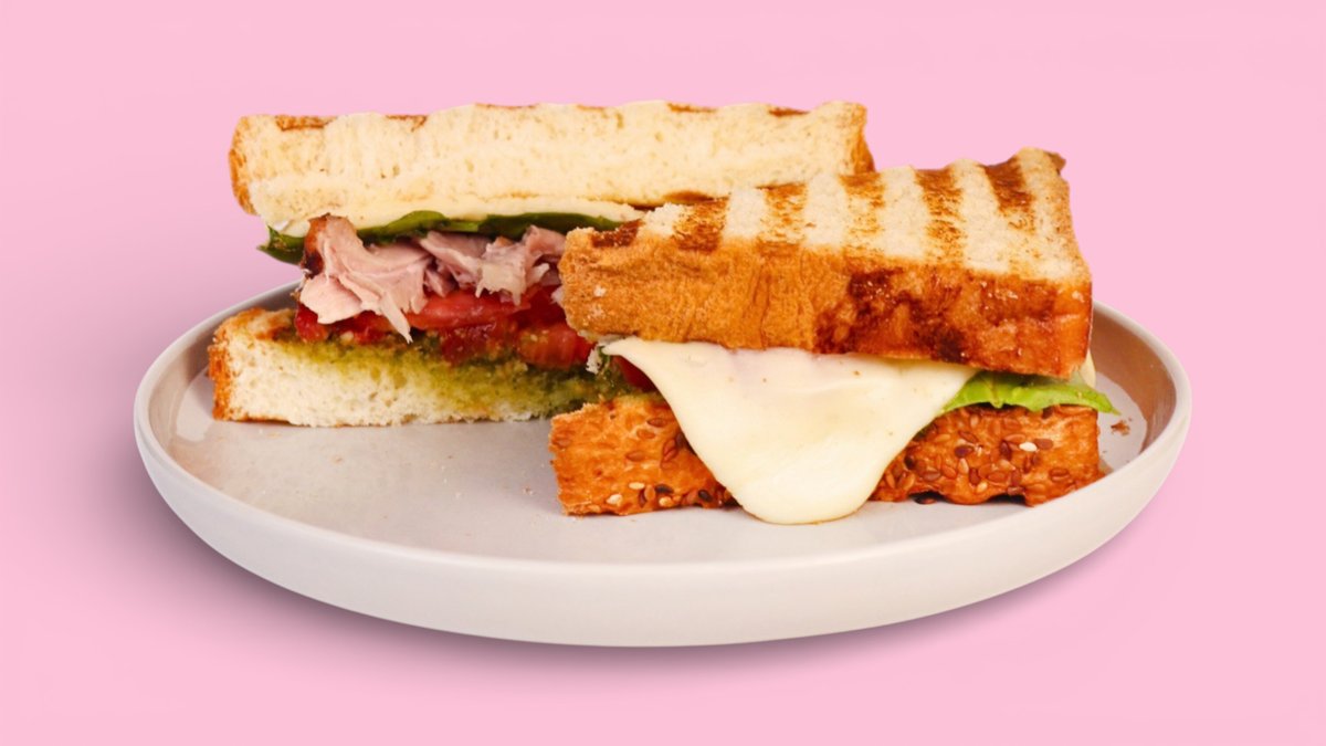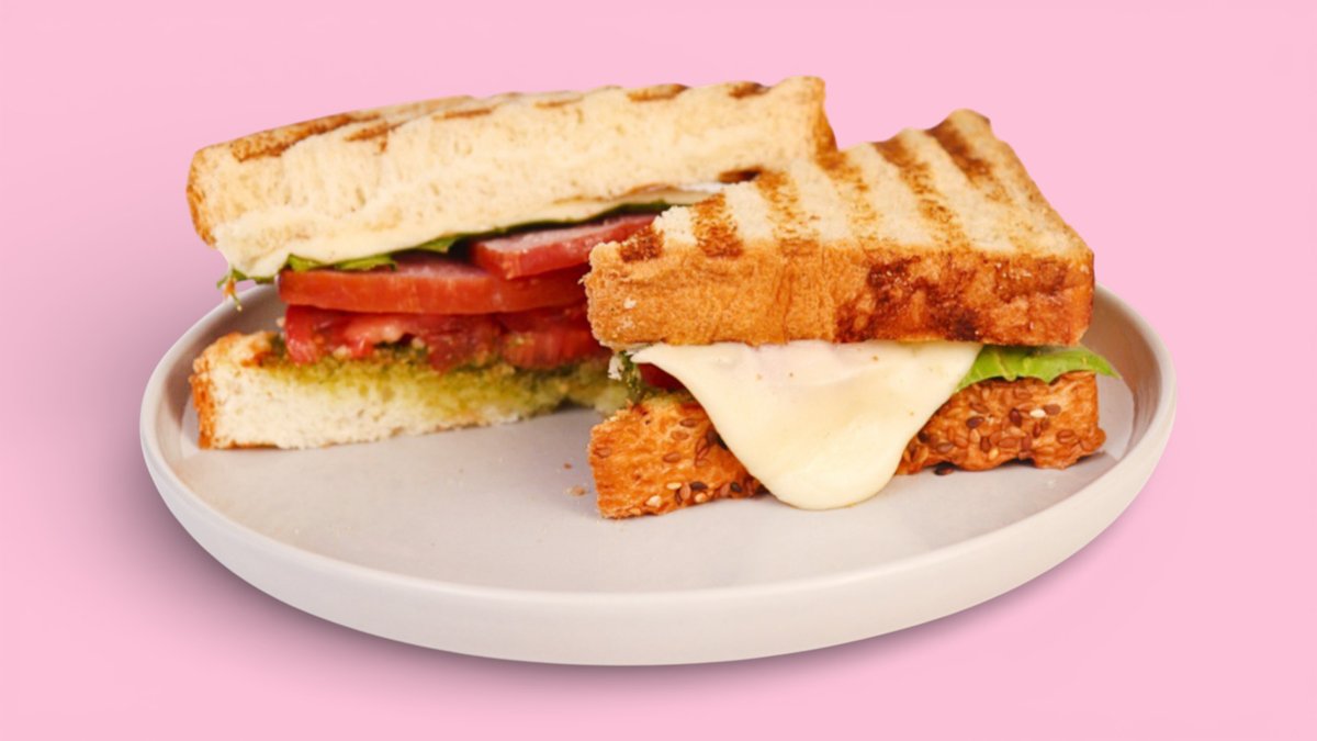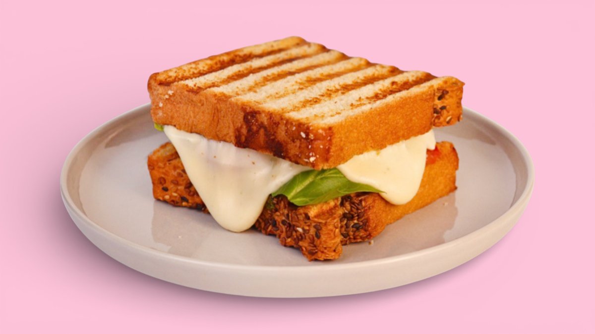300 гр тосторный хлеб, крем чиз, салатный лист, помидор, горчится зернистая,курица с паприкой ,соус песто , сыр мацарелла