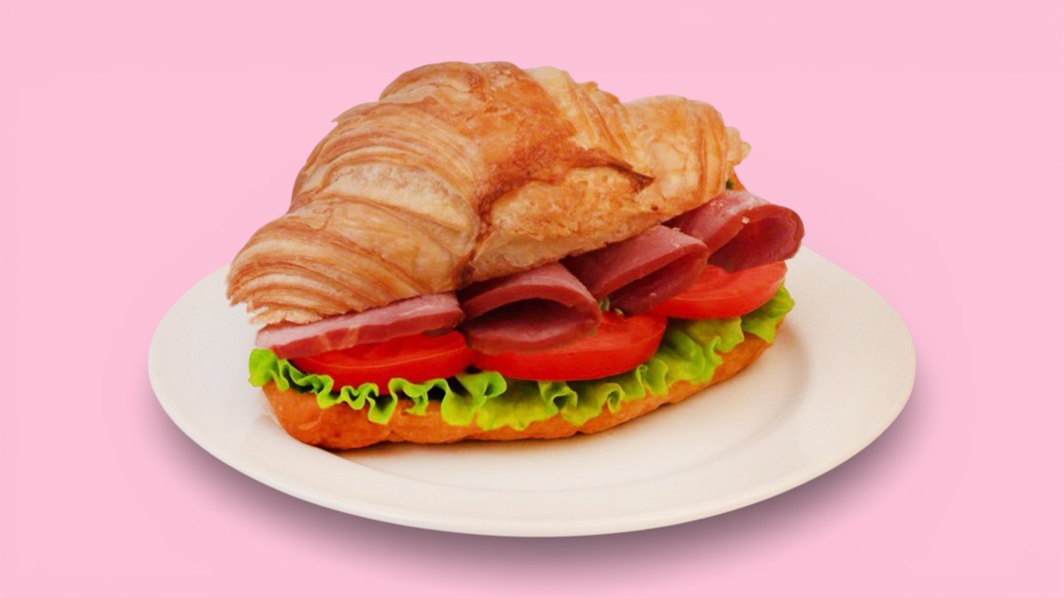 260 гр круассан , крем чиз, салатный лист, помидор, горчится зернистая, мясо копчёное