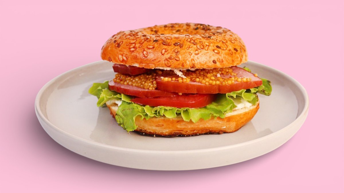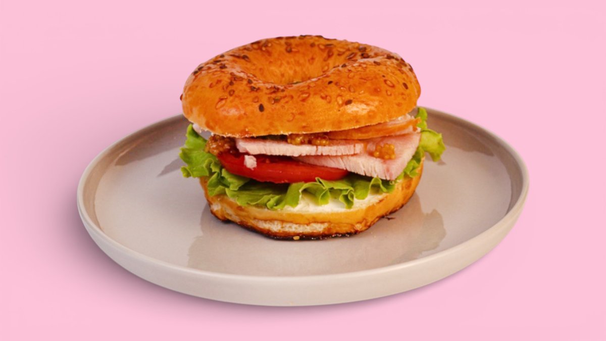 220 гр бейгл из ржаной муки , крем чиз, салатный лист, помидор, горчится зернистая, мясо копчёное