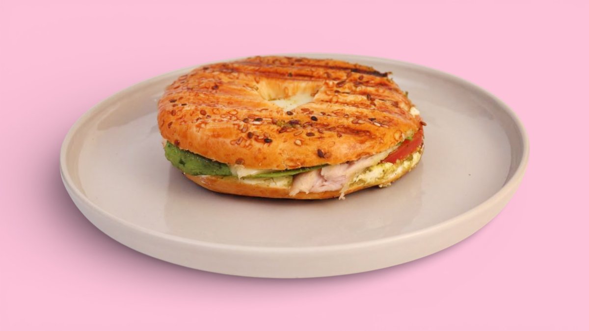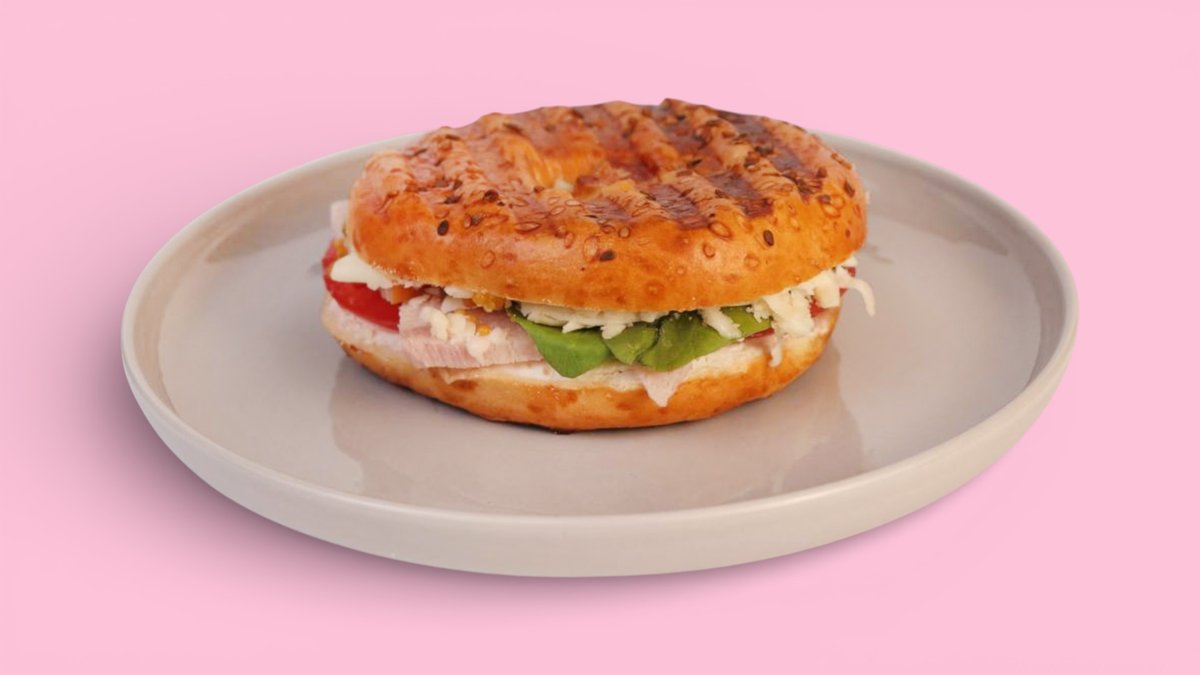300 гр бейгл из ржаной муки , крем чиз, салатный лист, помидор, горчится зернистая, индейка копчёная ,соус песто, сыр мацарелла