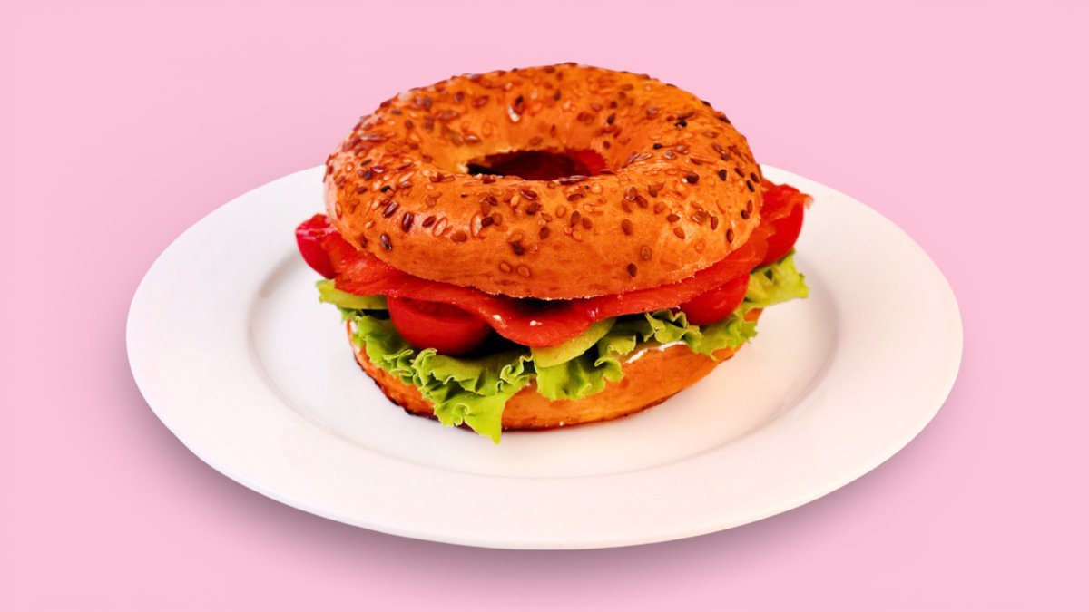210 гр бейгл из ржаной муки , крем чиз, салатный лист, помидор черри, авокадо, лосось слабосалённый .