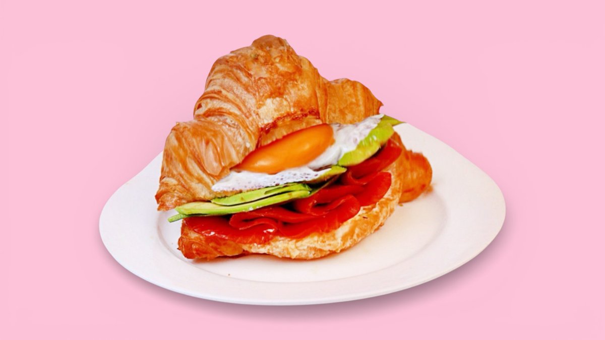 287 гр круасса, яйцо жаренное, крем чиз, салатный лист, помидор черри, авокадо, лосось слабосалённый .