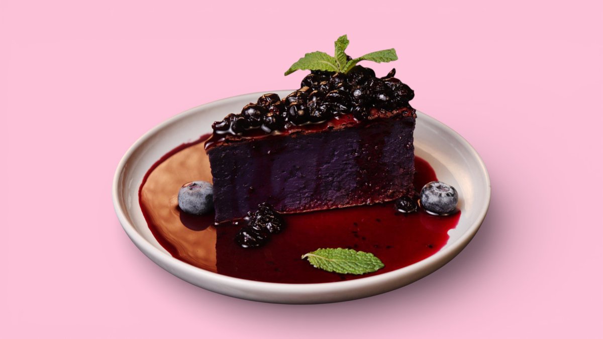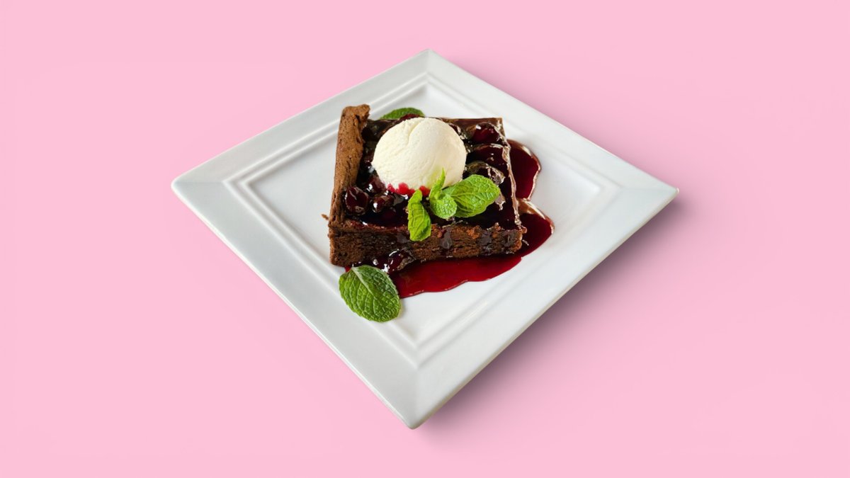 250 гр Бисквит брауни, вишнёвая конфи, ванильное мороженное, сезанные ягоды , мята