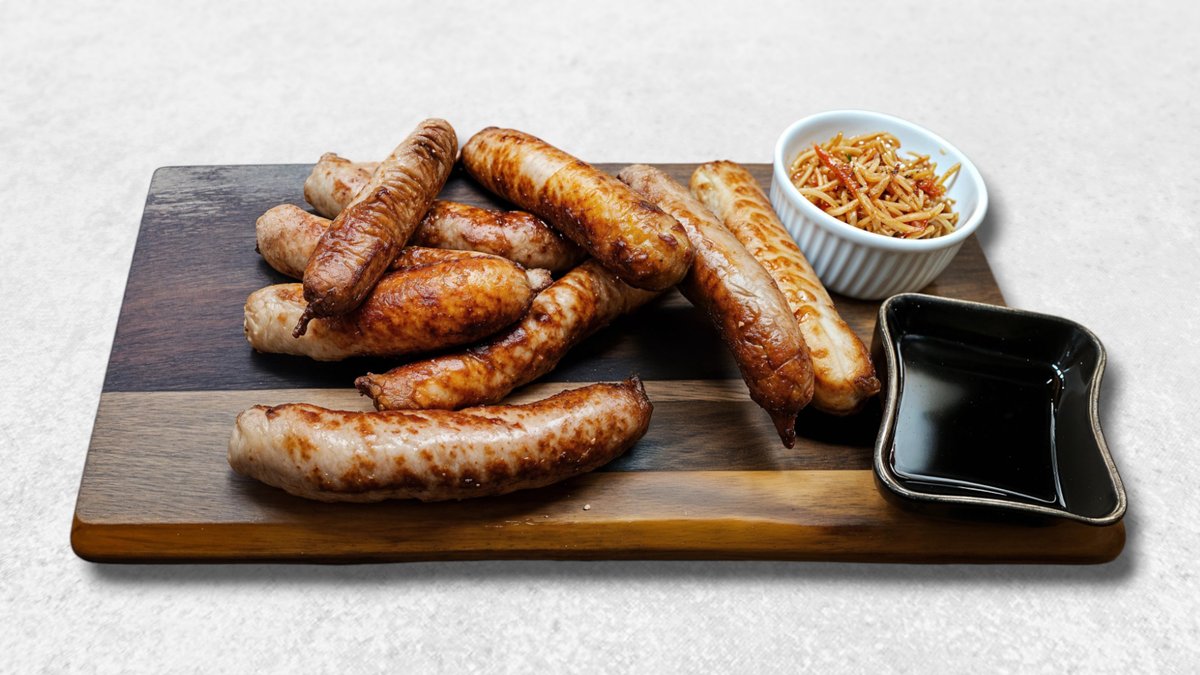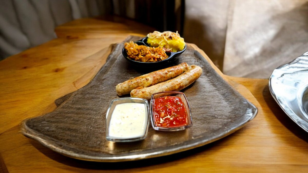 (8 фирменных колбасой, подаются гарниром из тушеной капусты, картофельным пюре с говяжьим беконом луком фри с горчично-сливочным соусом и соусом сальса)