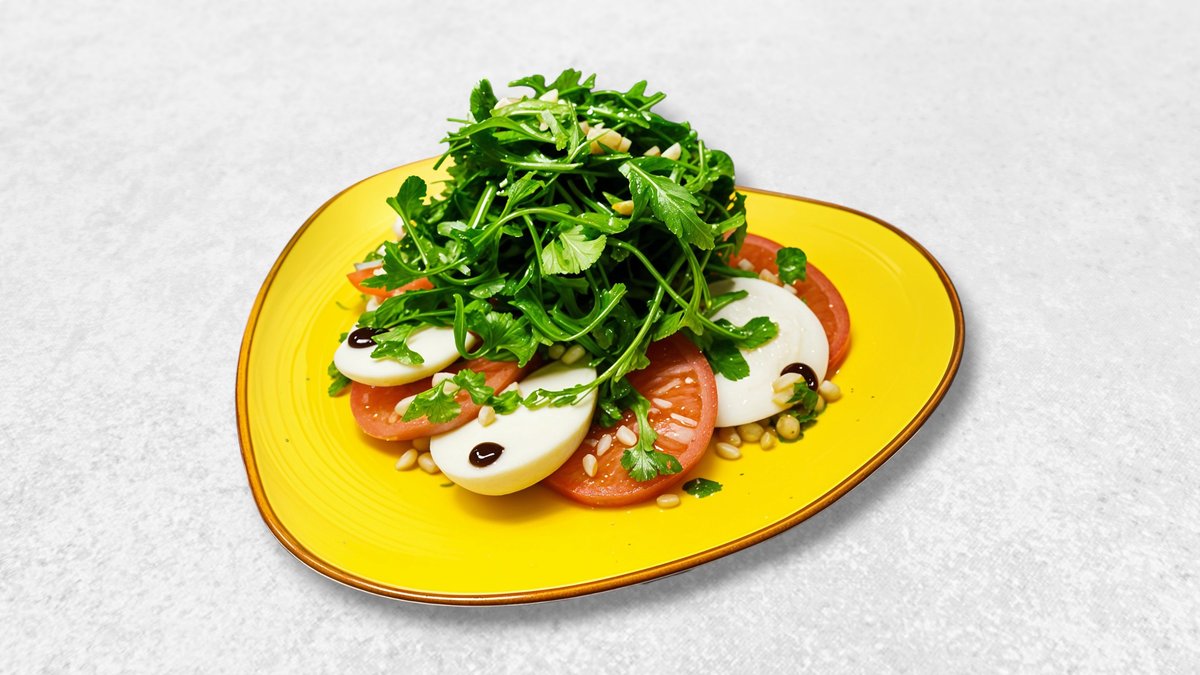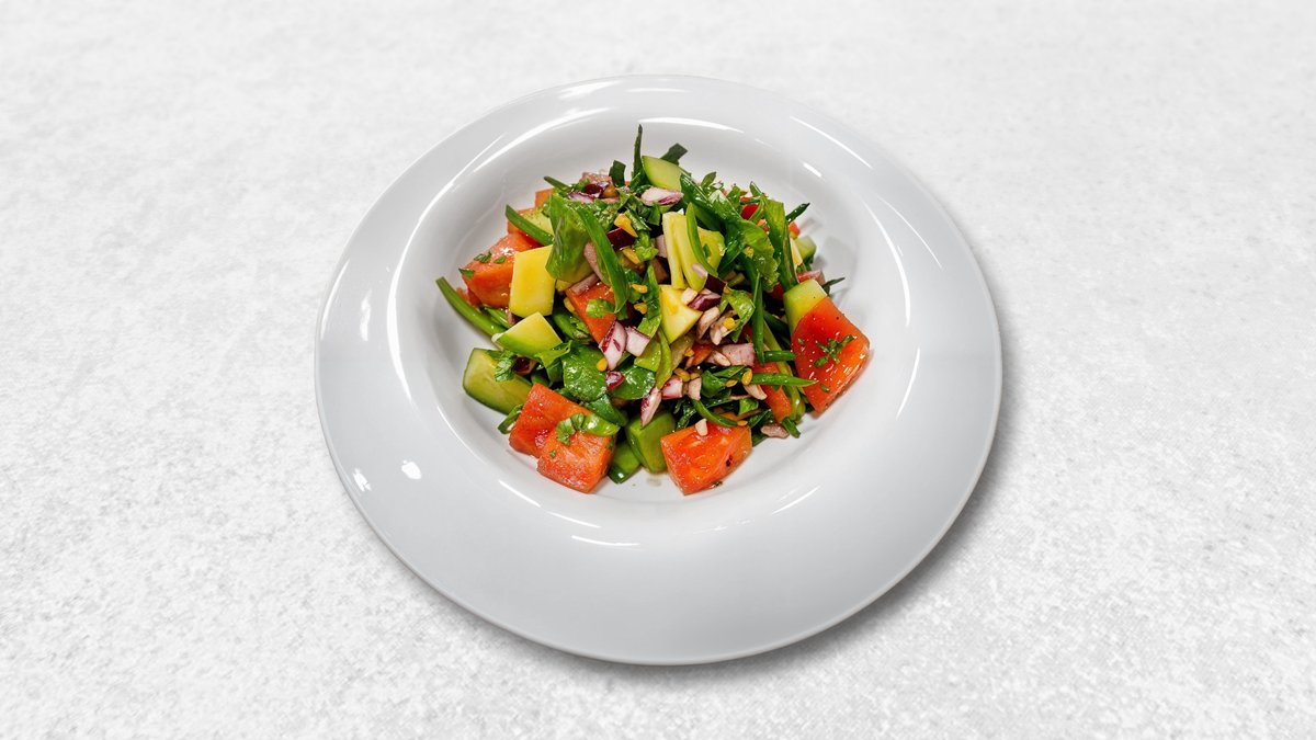 Различные свежие овощи (помидоры, огурцы, перец, редис, морковь, сельдерей), зелень, оливковое масло, лимонный сок, соль, перец.
