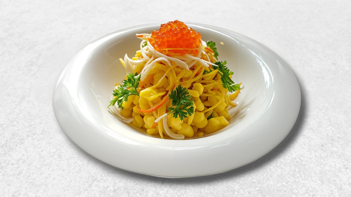 Крабовые палочки или мясо краба, кукуруза, яйца, огурцы, майонез, зелень.