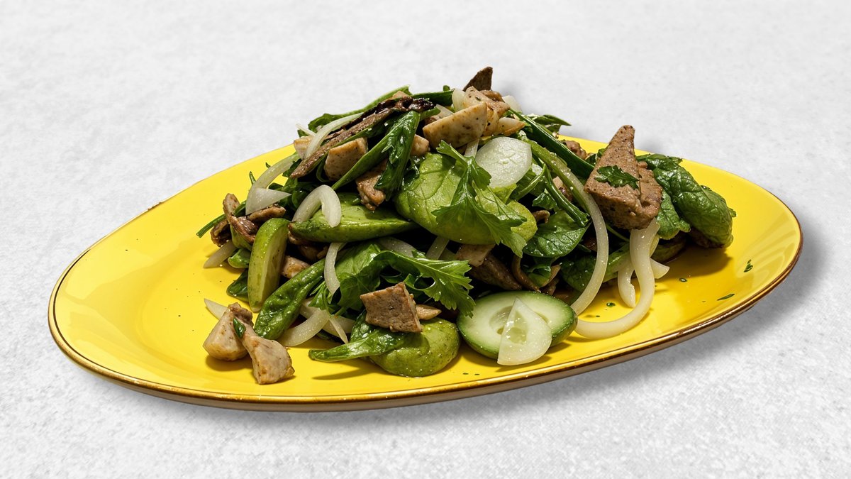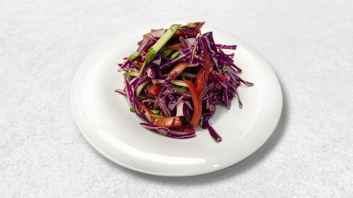Говядина, лапша, огурцы, морковь, капуста, чеснок, соевый соус, уксус, сахар, соль, перец, зелень (кинза или петрушка).