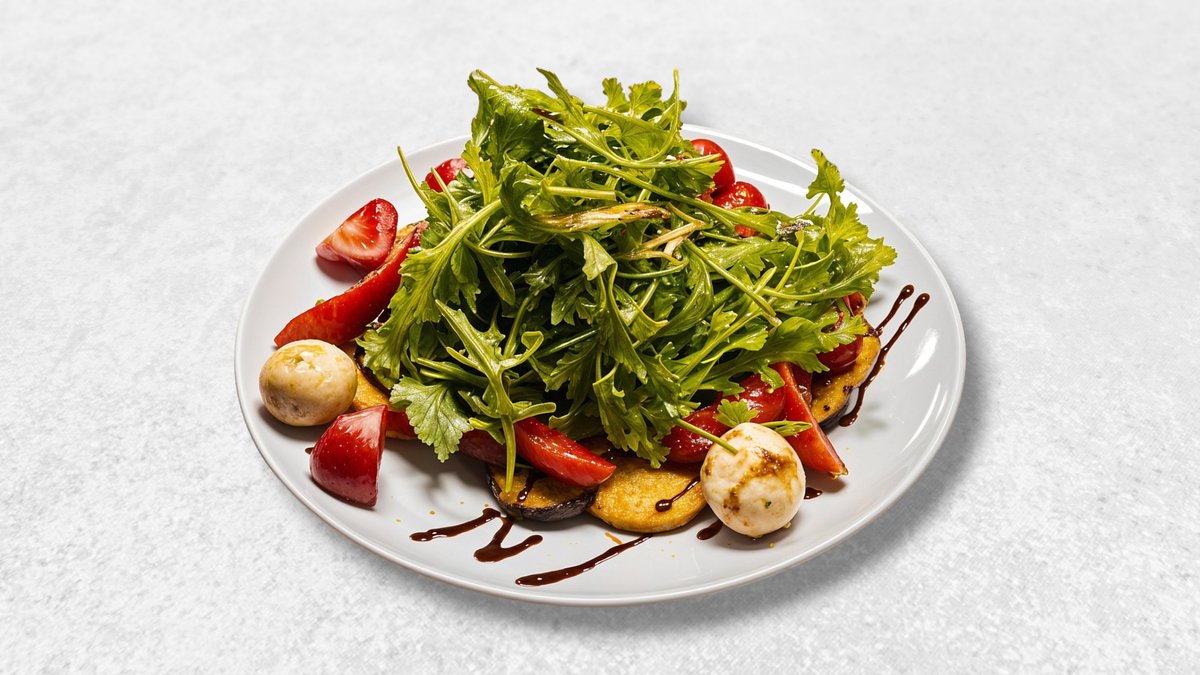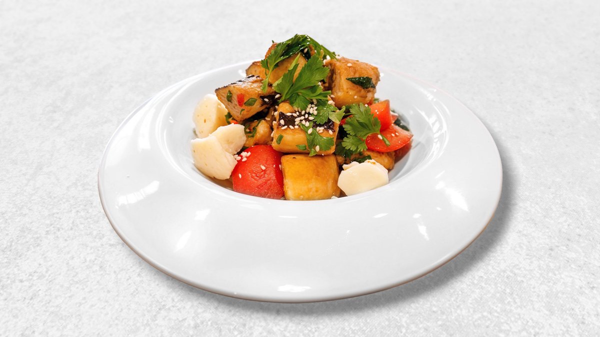 Салат с хрустящими баклажанами,томатами и сливочным сыром