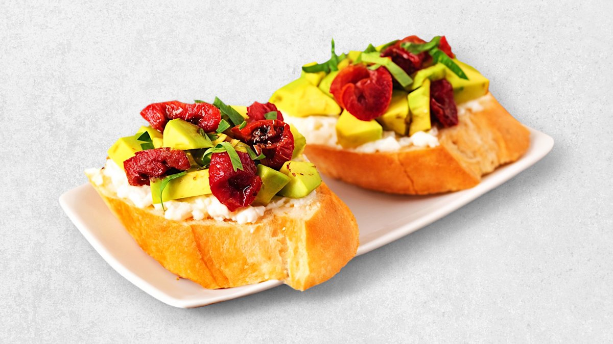 Брускетты с авокадо, сыром фета и вялеными томатами