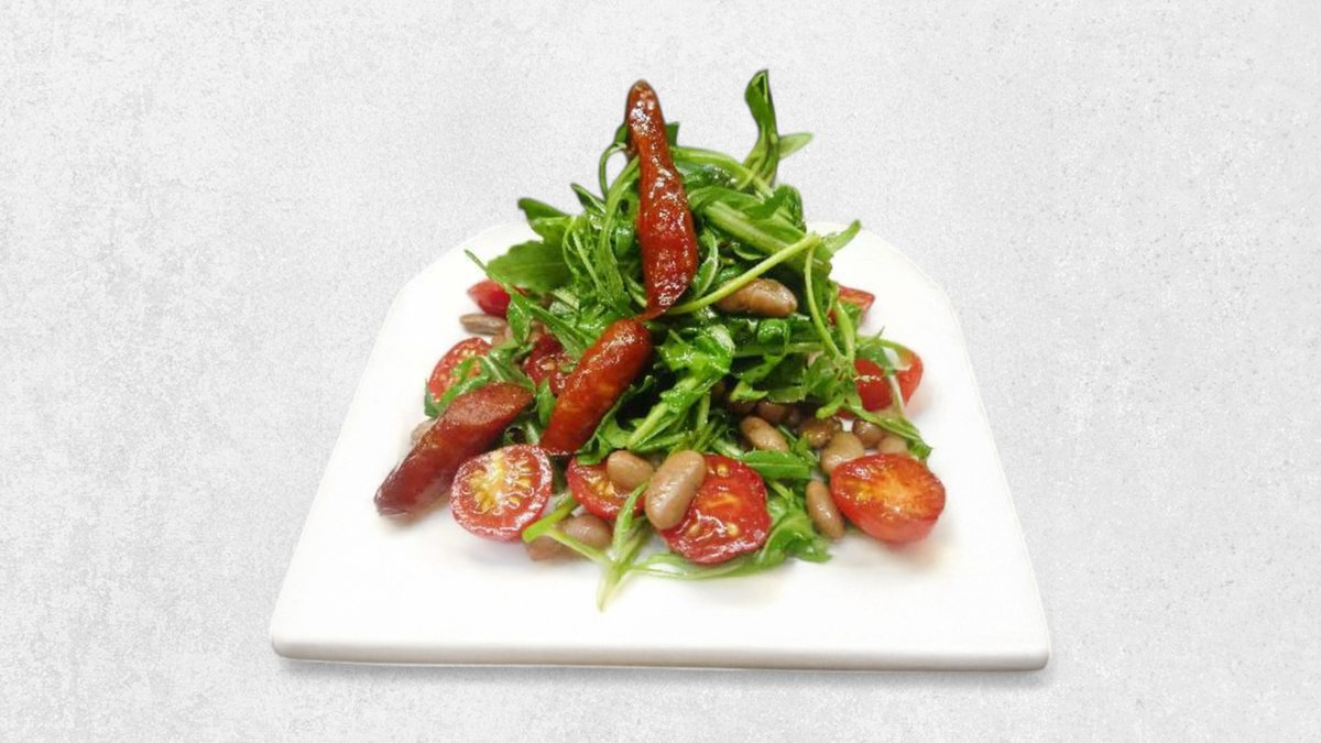 Куриное филе, красная фасоль, зелёный лук, салатные листья, оливковое масло, соль, перец.