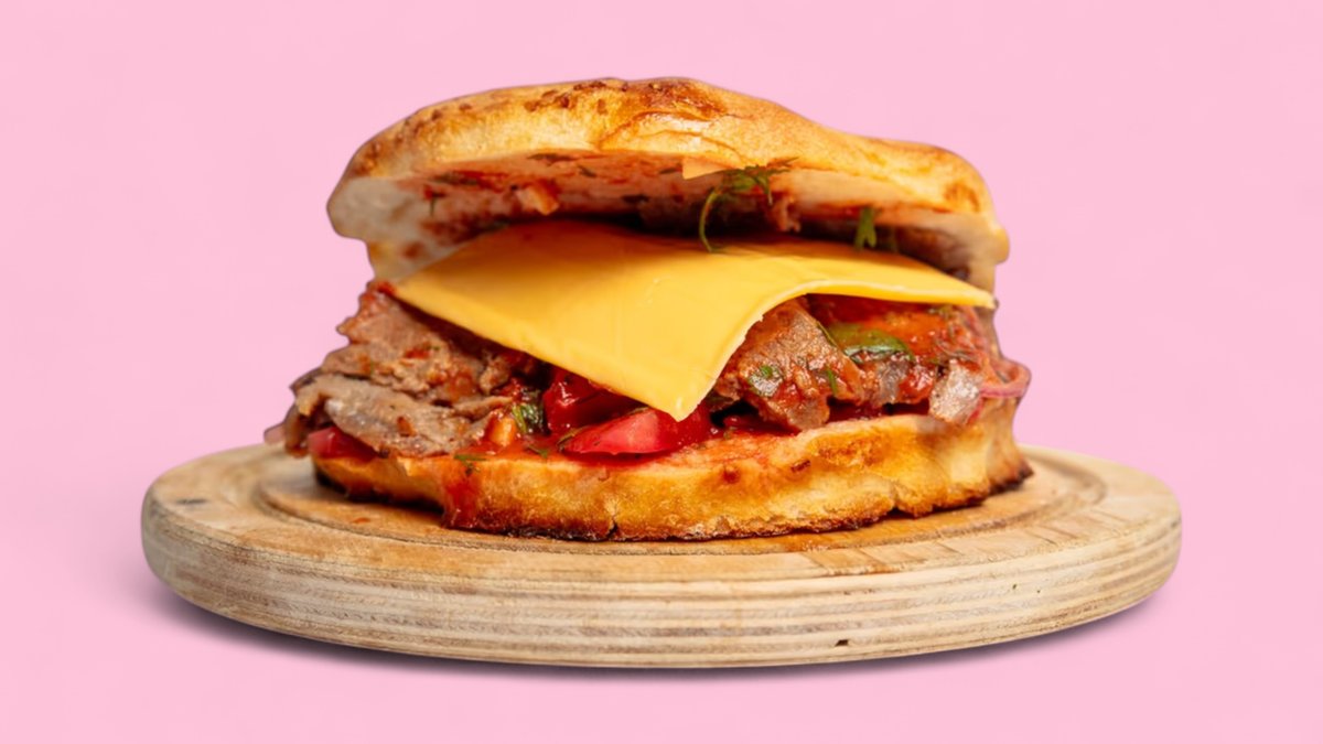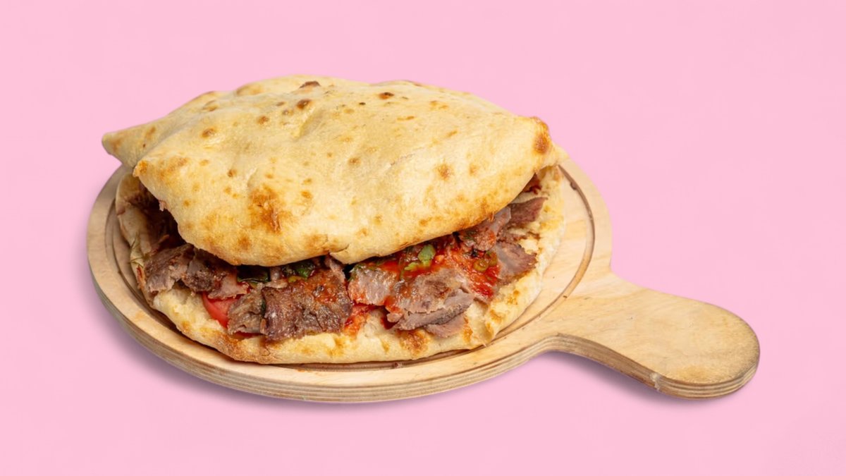хлеб из тандыра Пита, мясо говядина, свежего огурцы, сочного помидора, соус, сыр