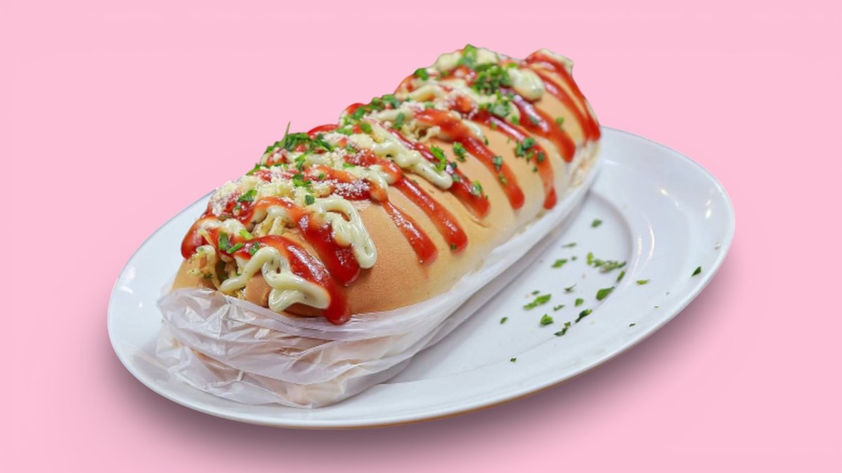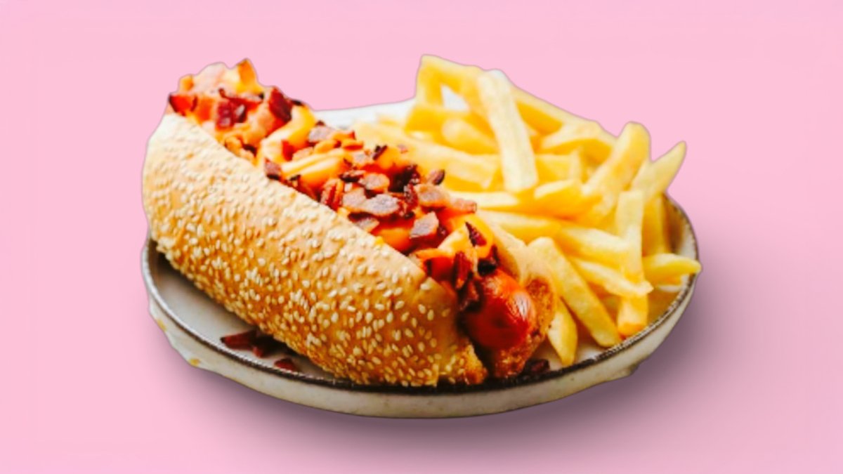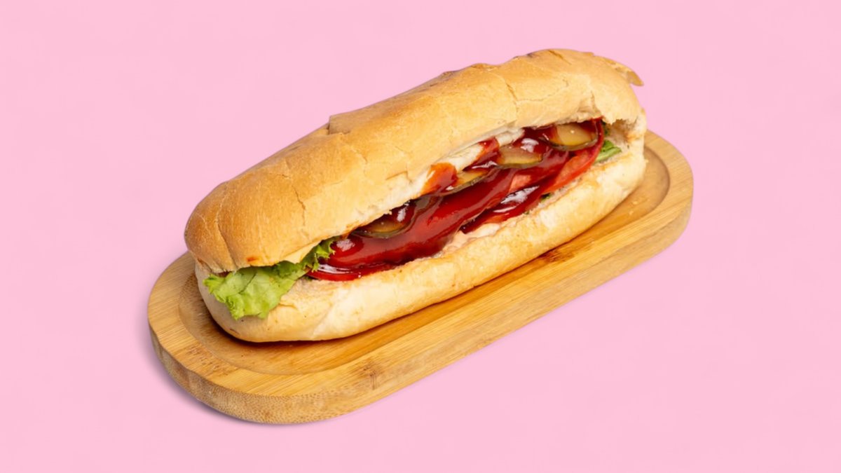 булочка, сосиска, помидор, огурец, спец соус, сыр
